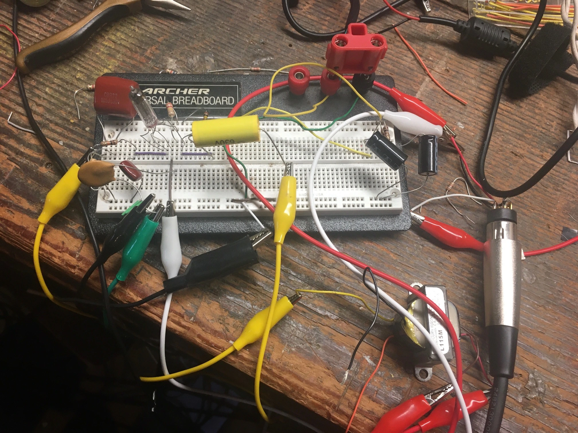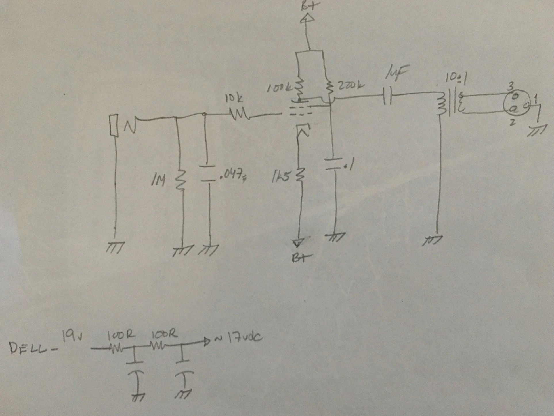 The plate and screen resistor values I got from another website guitar boost pedal. I didn't want to have to use the buffer all the time, so I have some MXL 2:1 mic transformers leftover, so I tried sticking one of those on the front end that helped tame the distortion, but doesn't sound quite right and I lose the "good" distortion. The laptop PSUs are dirty as hell, so needed some filtering. Lose about 2 volts or so. Now note, my optest is into a vintage Shure M68 mixer to my old Boombox. But I don't think that's the distortion. I also stuck a simple transistor buffer to get a line level output and used the line in on the 'box. Anyway, here it is schematic and breadboard for your comments and criticisms and any suggestions for improvement.