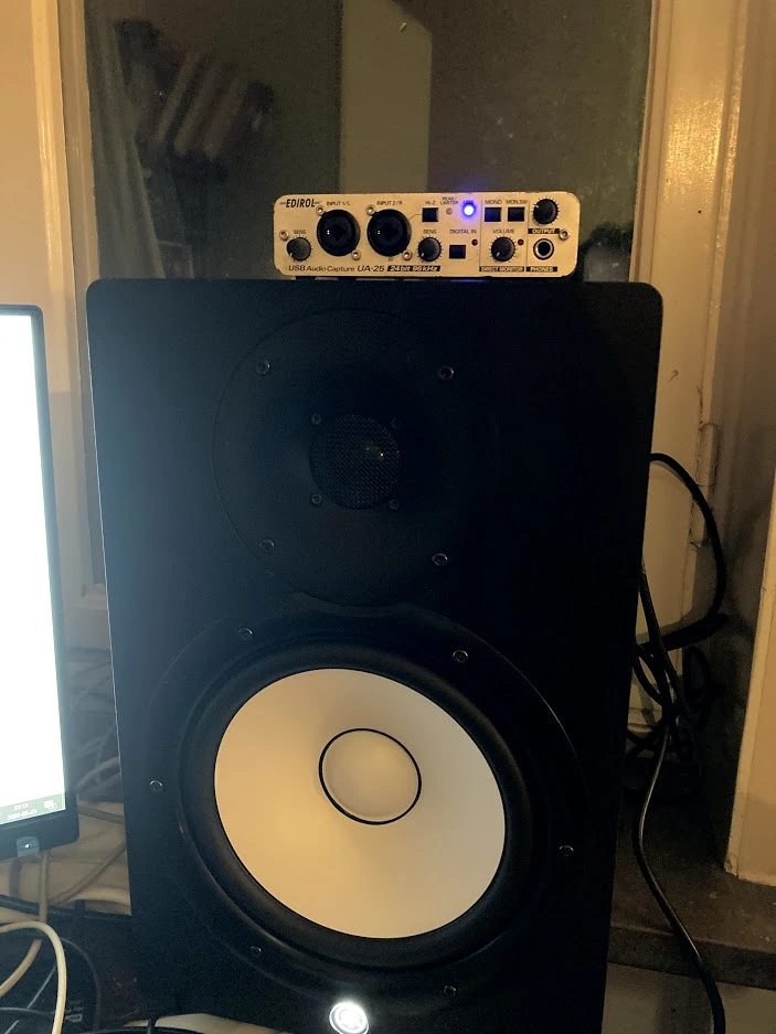 Computer (Surface Pro) -> USB audio interface (Edirol UA-25) -> Monitor (Yamaha HS8,) balanced input and output.