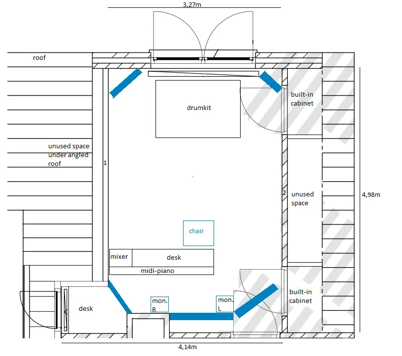 . I would also like to design it a bit since I think that might make the songwriting and teaching in this room more enjoyable and for teaching it also helps to look professional. And while I also have much equipment that needs improving I'd like to start with the acoustic treatment so I can finish the design of my studio.