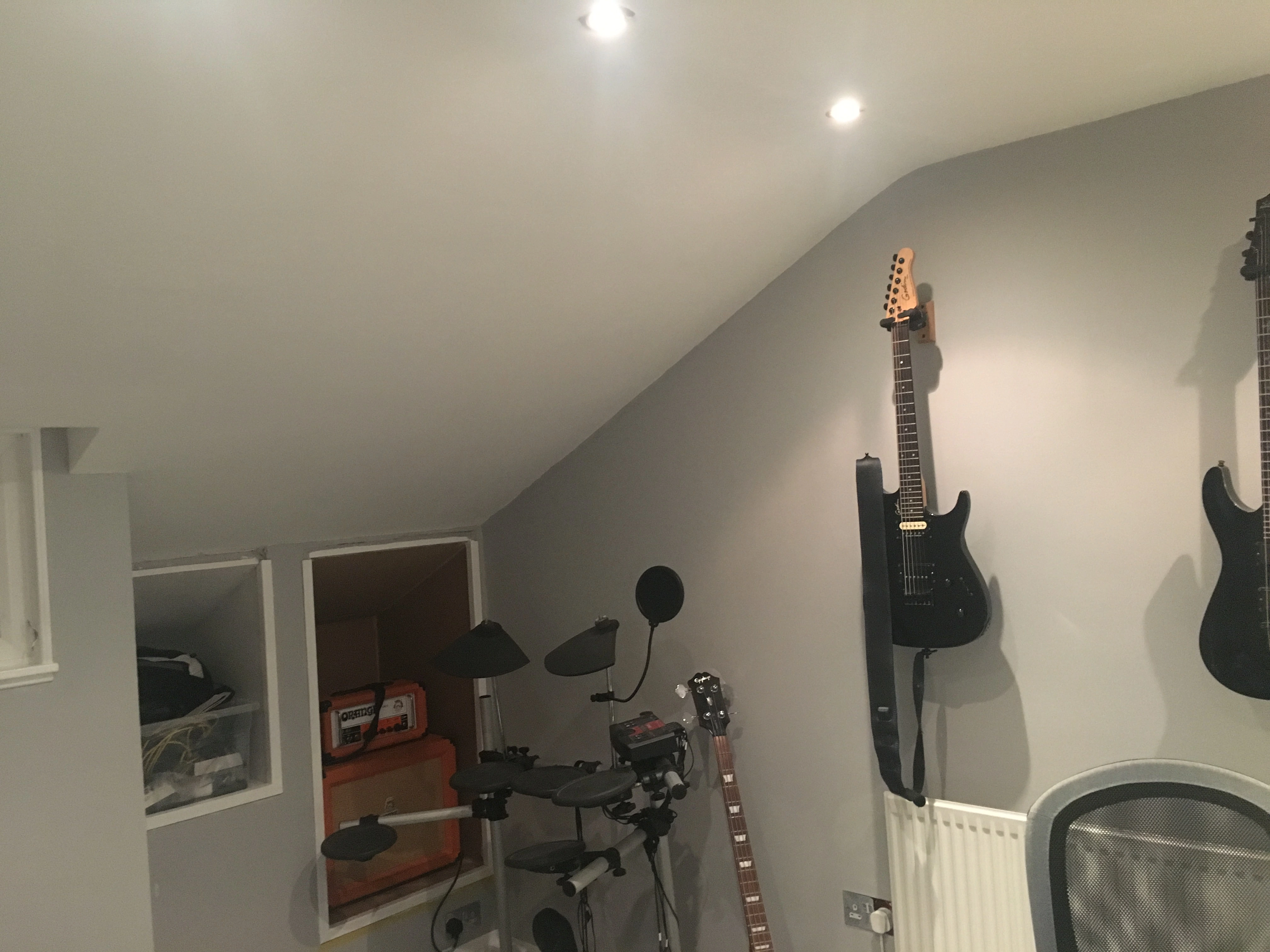 2. What treatment should i be looking at for the room, if i keep the desk where it is? My brain seems to tell me that I should put some dampeners on the slanted ceiling to stop the audio bouncing back off it and hitting my ears but that may just be me making things up!