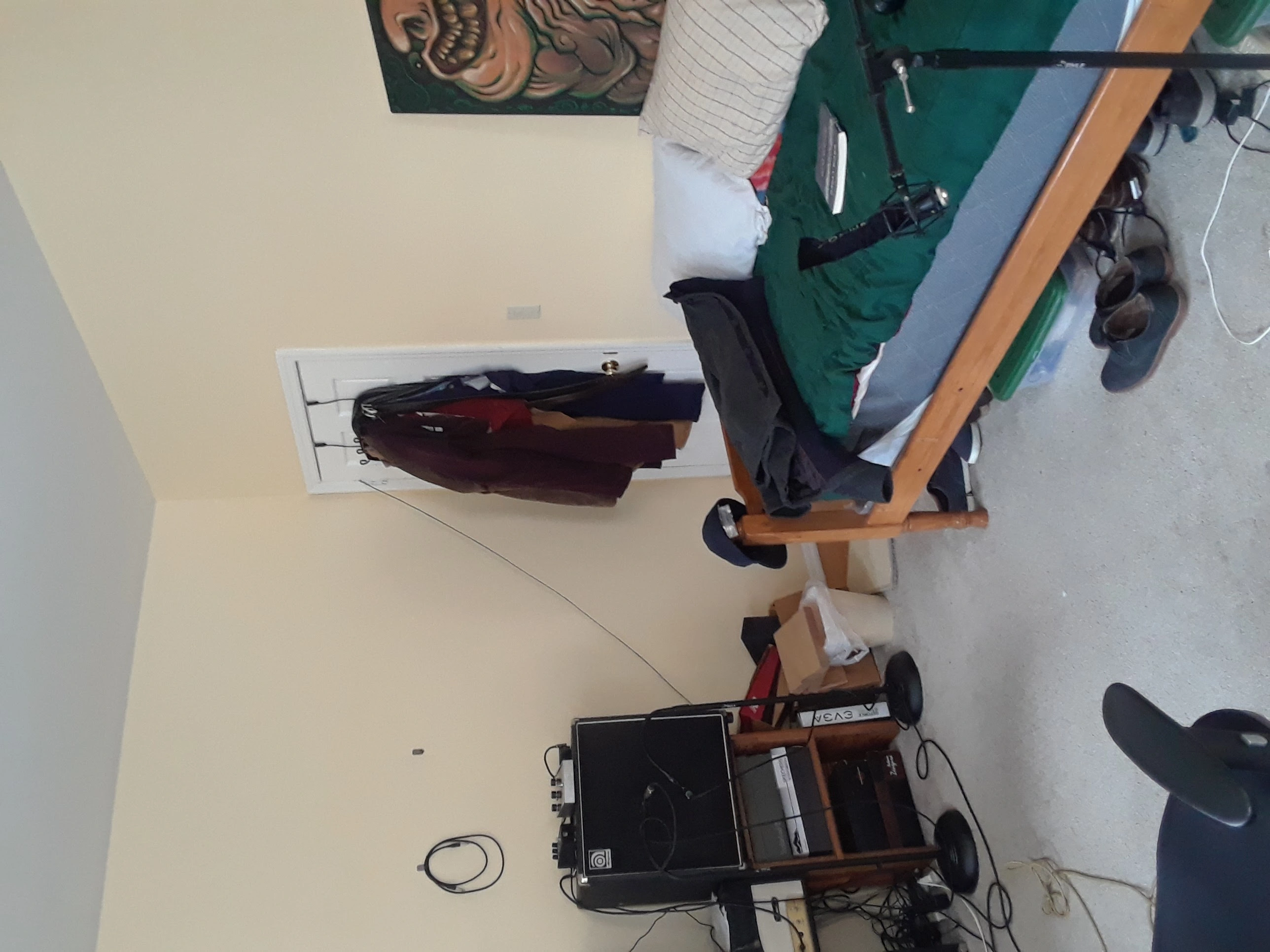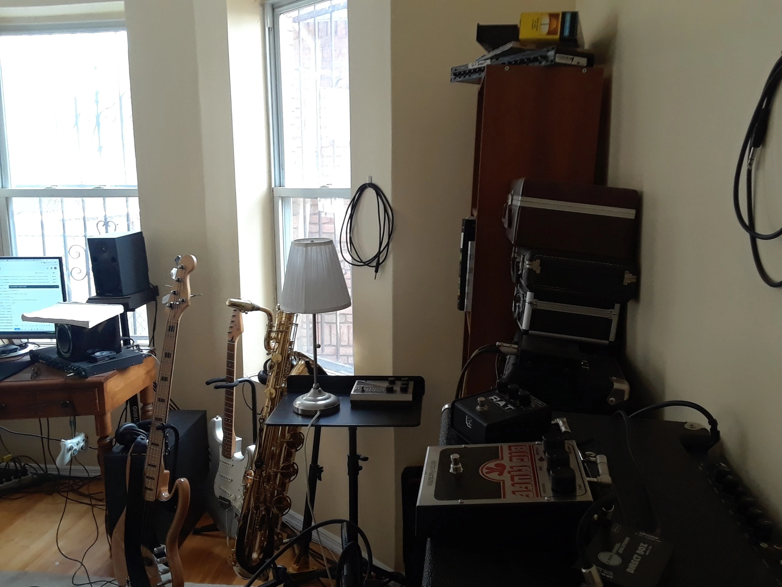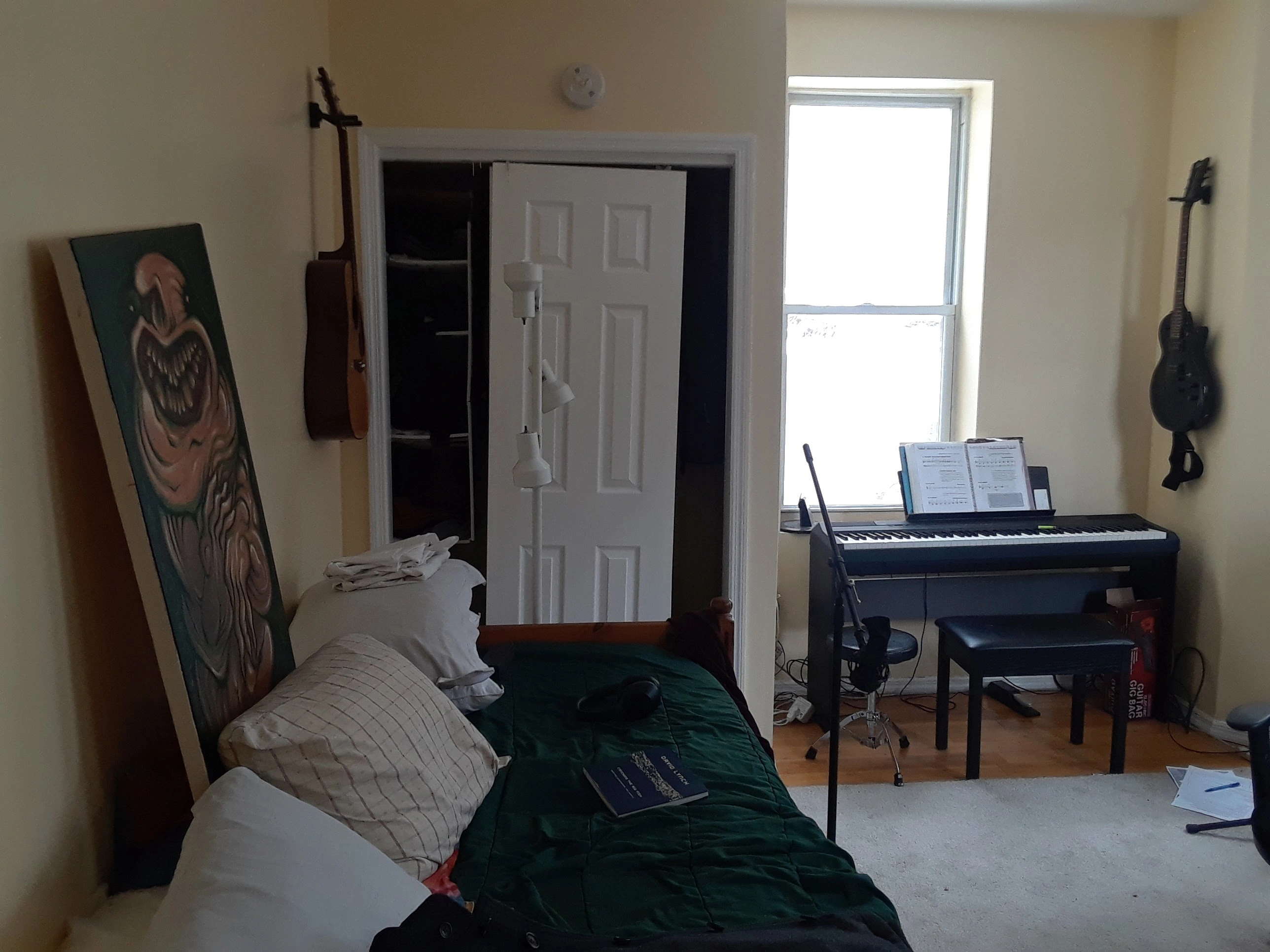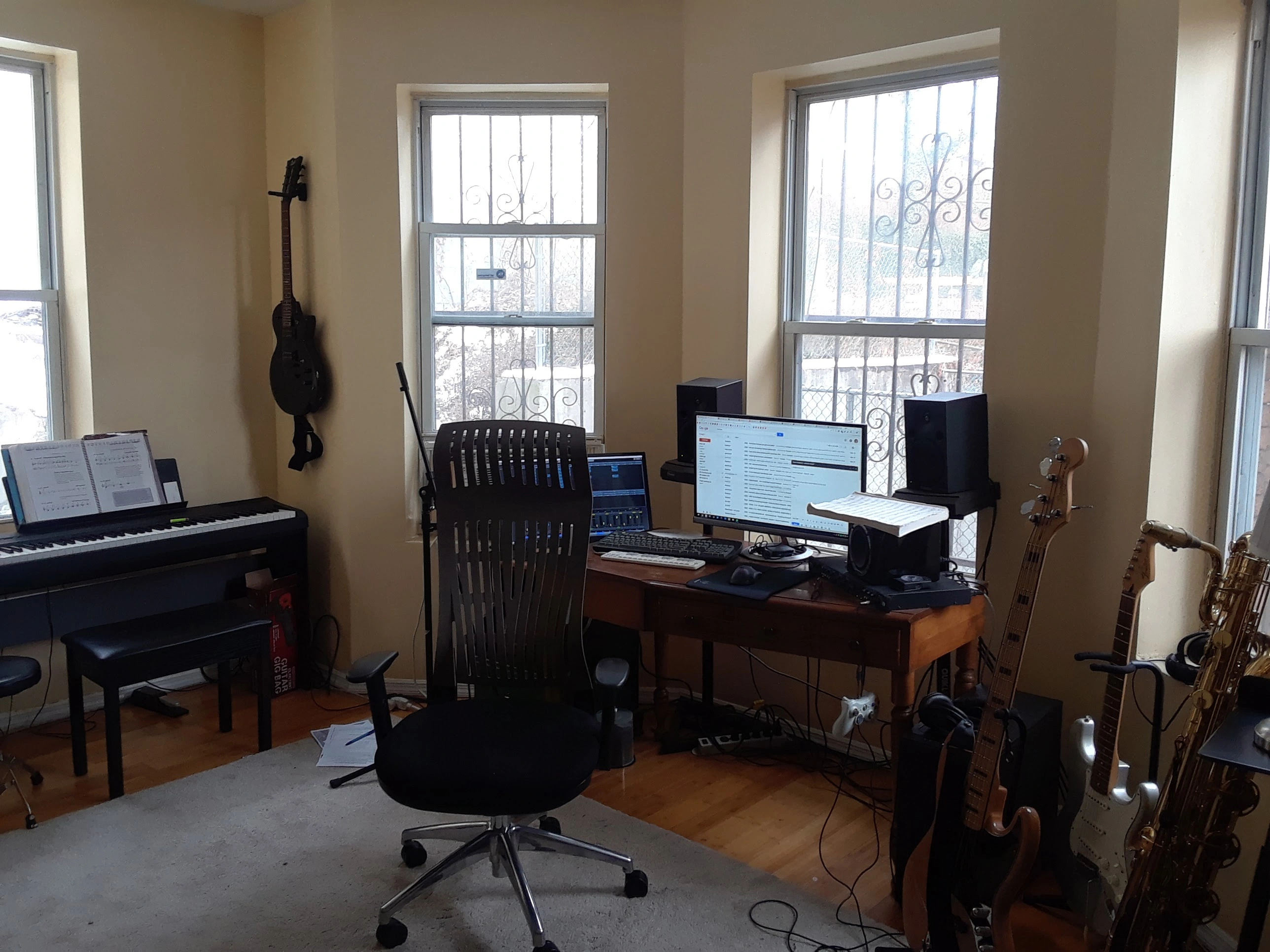 You can see a diagram I made of the room below, as well as some photos of the room. It's kind of a weird shape so I'm not sure how to handle the extra corners, for example. Appreciate any help!