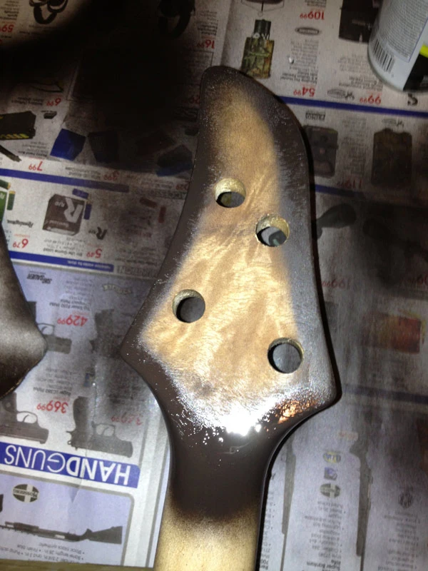 I'm having a little problem with the clearcoat. I sprayed the sunburst on the head and completely painted the neck. When I went to put on a clearcoat, it lifted the paint; as in bubbled and peeled. I waited a day or so between paint and clearcoat. I suspect the weather is too hot for the lacquer finish. We've been pushing over 100F (37C) everyday.