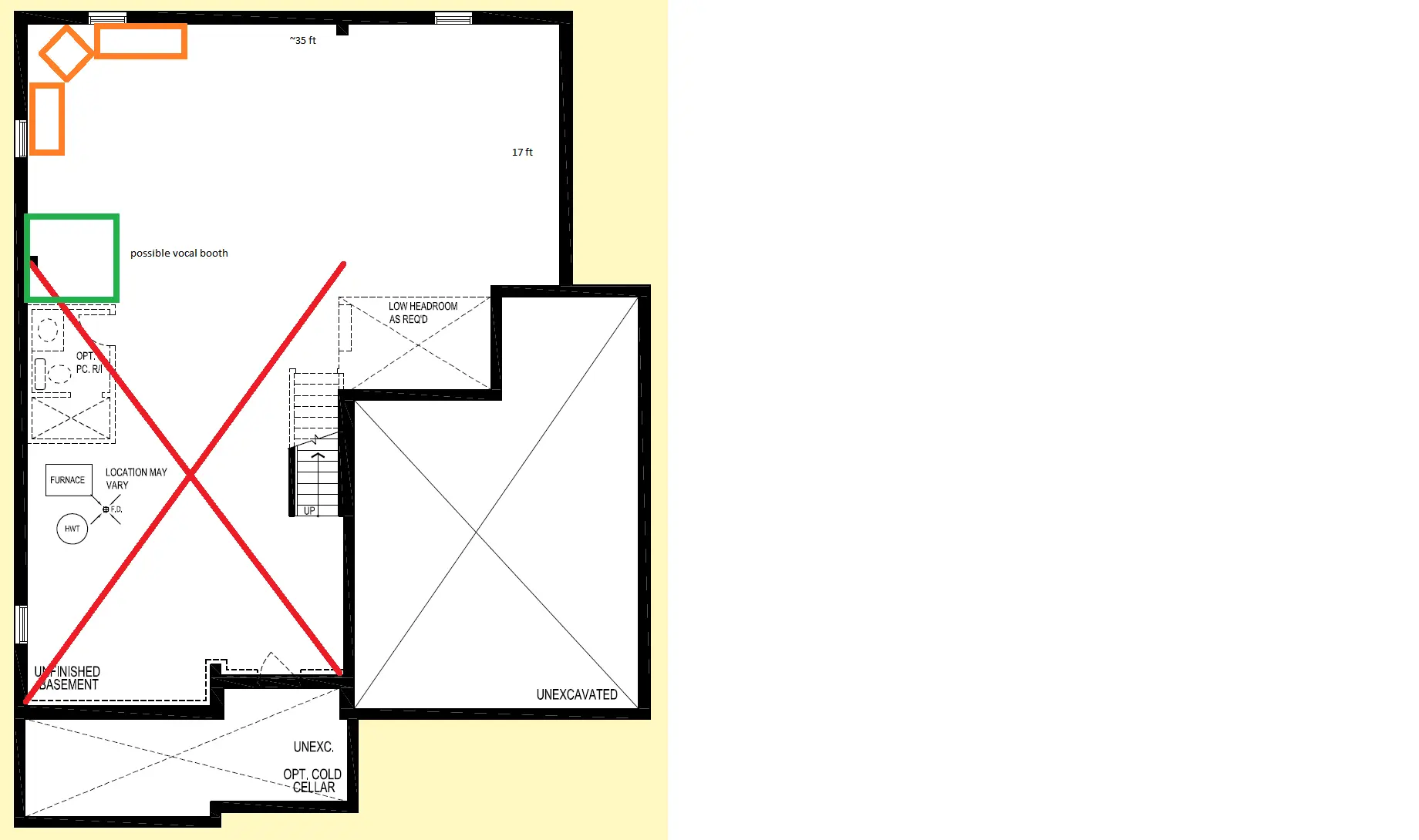 Moved into a new house and basement is unfinished - planning on finishing it over the year. Plan is to use some of it for a home studio/jam space. I'm not a professional and this is pretty much a hobby and my bands will be using to rehearse and track demos etc.. That being said, just looking for advice on placement of my desk in the room. The Red X is pretty much out of question as far as useable space goes but just highlighting the possible standing waves that would travel that way. Out of the three spots (orange boxes) where should I place my desk/studio monitors. I will have acoustic treatment/bass traps etc. I'm also open to moving the desk to the opposite side. Whatever side is unused will be used for a home theater/lounge area. Thanks!