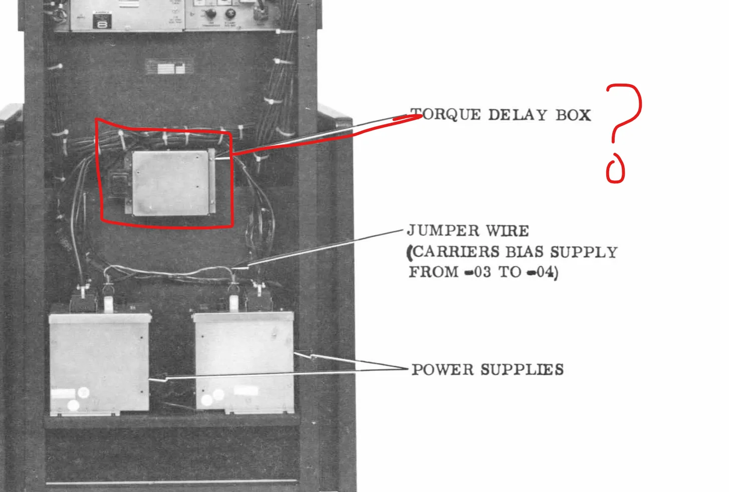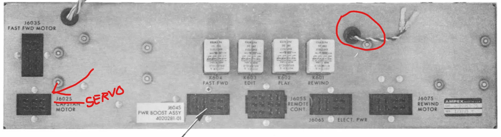 That box…from the blurry picture of the guts of the box I was able to read the p/n off the PCB and, looking in the manual above, I find that is the torque delay module. The AG-440 was never designed to handle 1” tape…none of it. It was a kludge. So there were things they needed to glom on to it to get it to work acceptably well as far as tape handling. In order for it not to take forever to reach proper speed in PLAY, the torque delay module effectuates a delay in the holdback tension of the supply reel motor, so the capstan drive and takeup tension aren’t working against that when you go from STOP to PLAY. There is also torque boost module that gives the takeup motor some extra juice at the same time…that’s the big box smack in the middle of the underside of the transport where the signal electronics power supply usually goes on a standard 1/4”~1/2” AG-440.