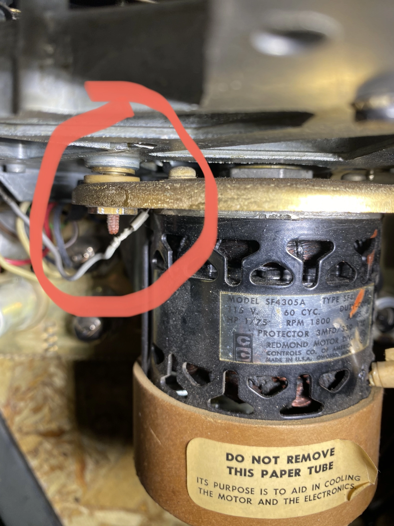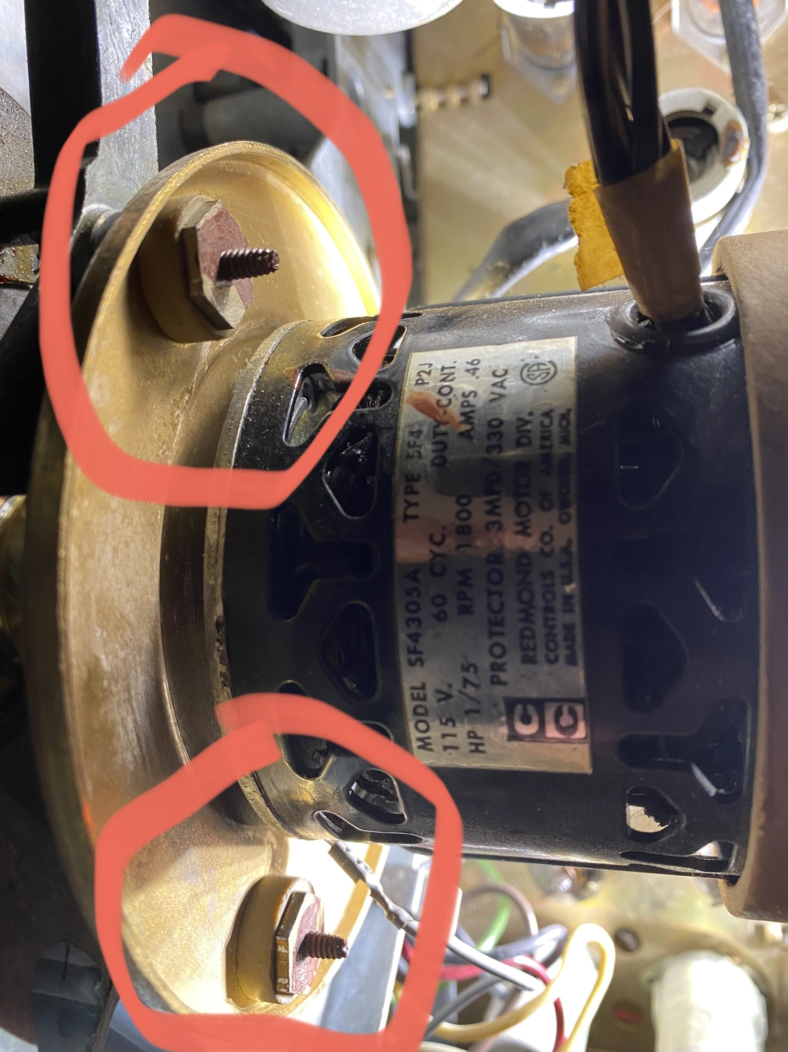 Hello, for the Ampex people. The motor is mounted with three bolts each of which has two bushings on either side of the front metal round plate. I've searched the service manual but I can't find an answer--and the part designation seems to be missing or mislabeled (see pics). My question is if these are supposed to be tightened down flush against the frame, or if they are set according to some other criteria. It appears that someone has put some glue or some adhesive to lock the nuts in place on the bolt, so that when I turn the nut with a wrench the entire bolt turns.