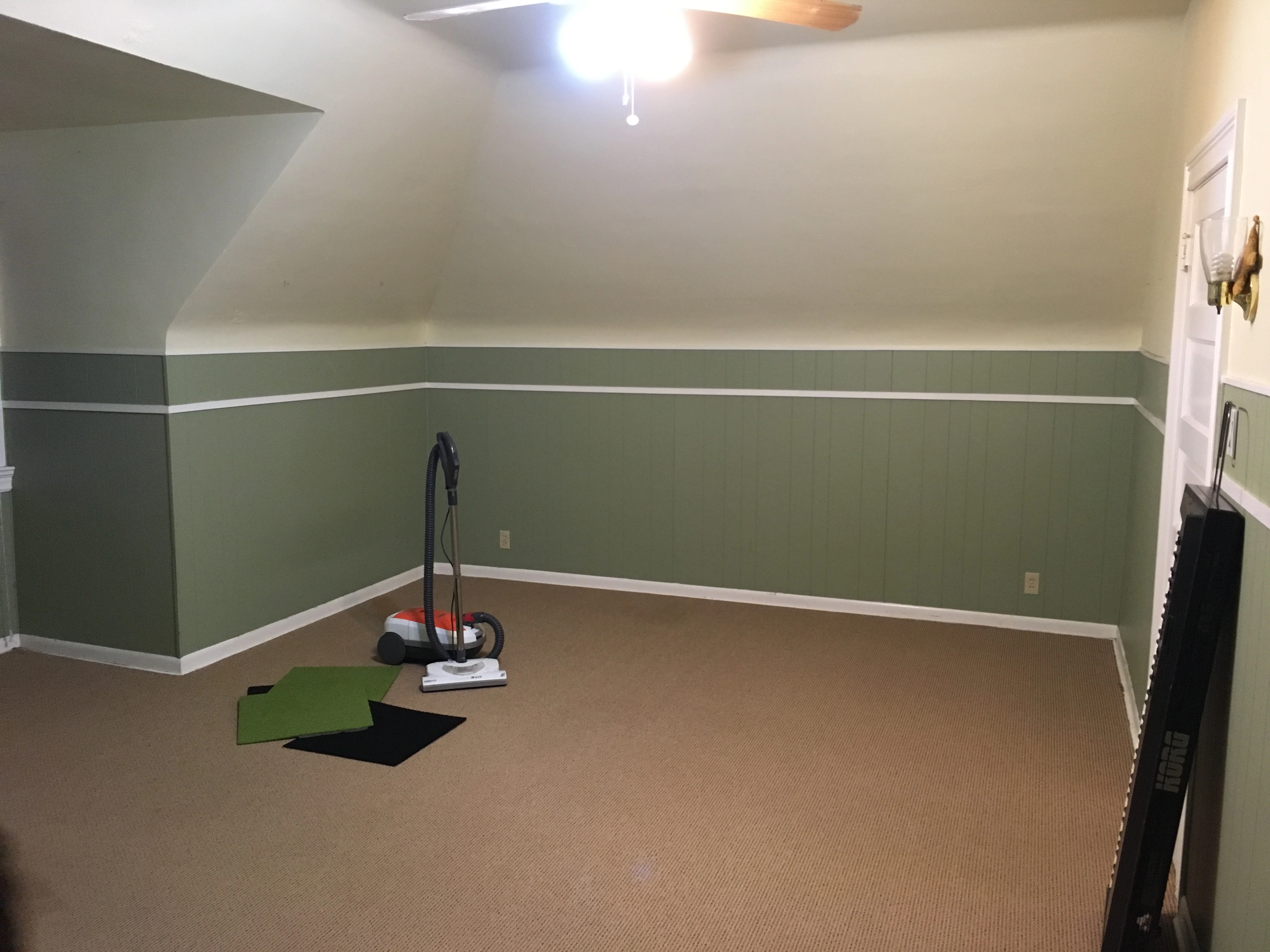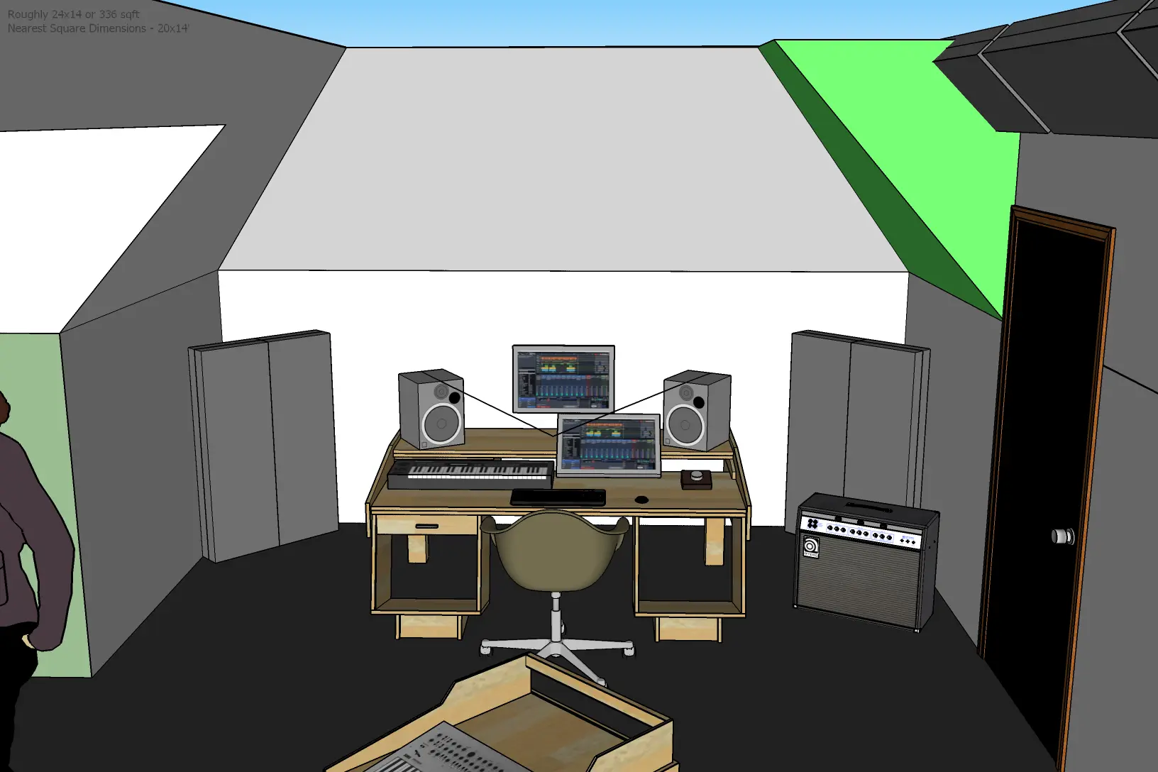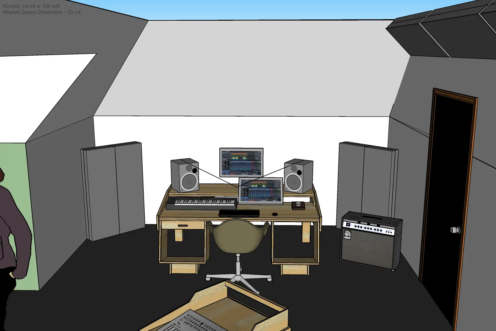 The room we're moving into is bigger than the space we're currently using, but it's not without its challenges -- it's an irregular shape, and lots of ceiling angles. It's about 20' x 14' (if you don't count the dormer out-croppings). We'll be using the space for both tracking (vocals, guitar) and mixing, with mixing as the top consideration.
