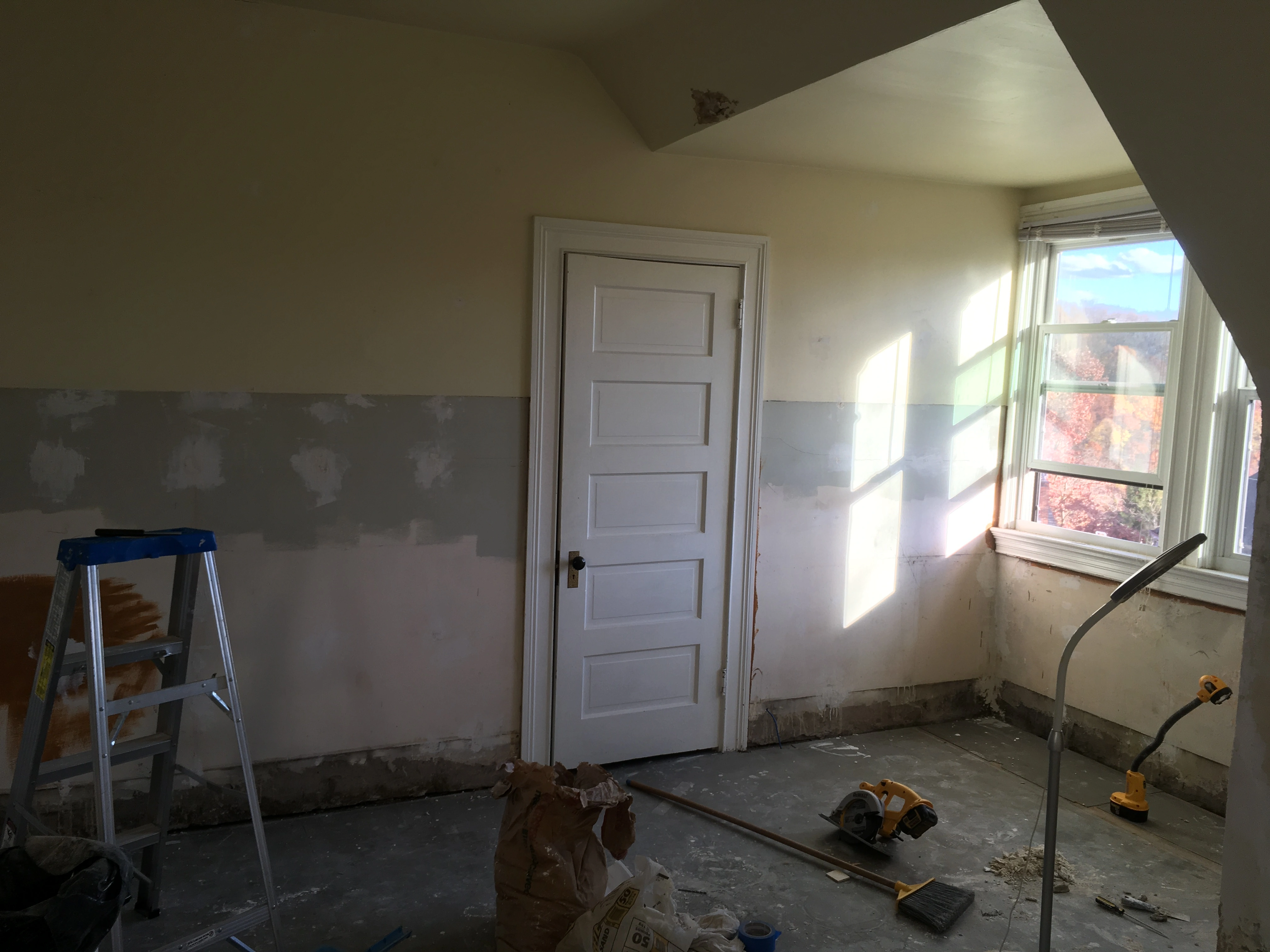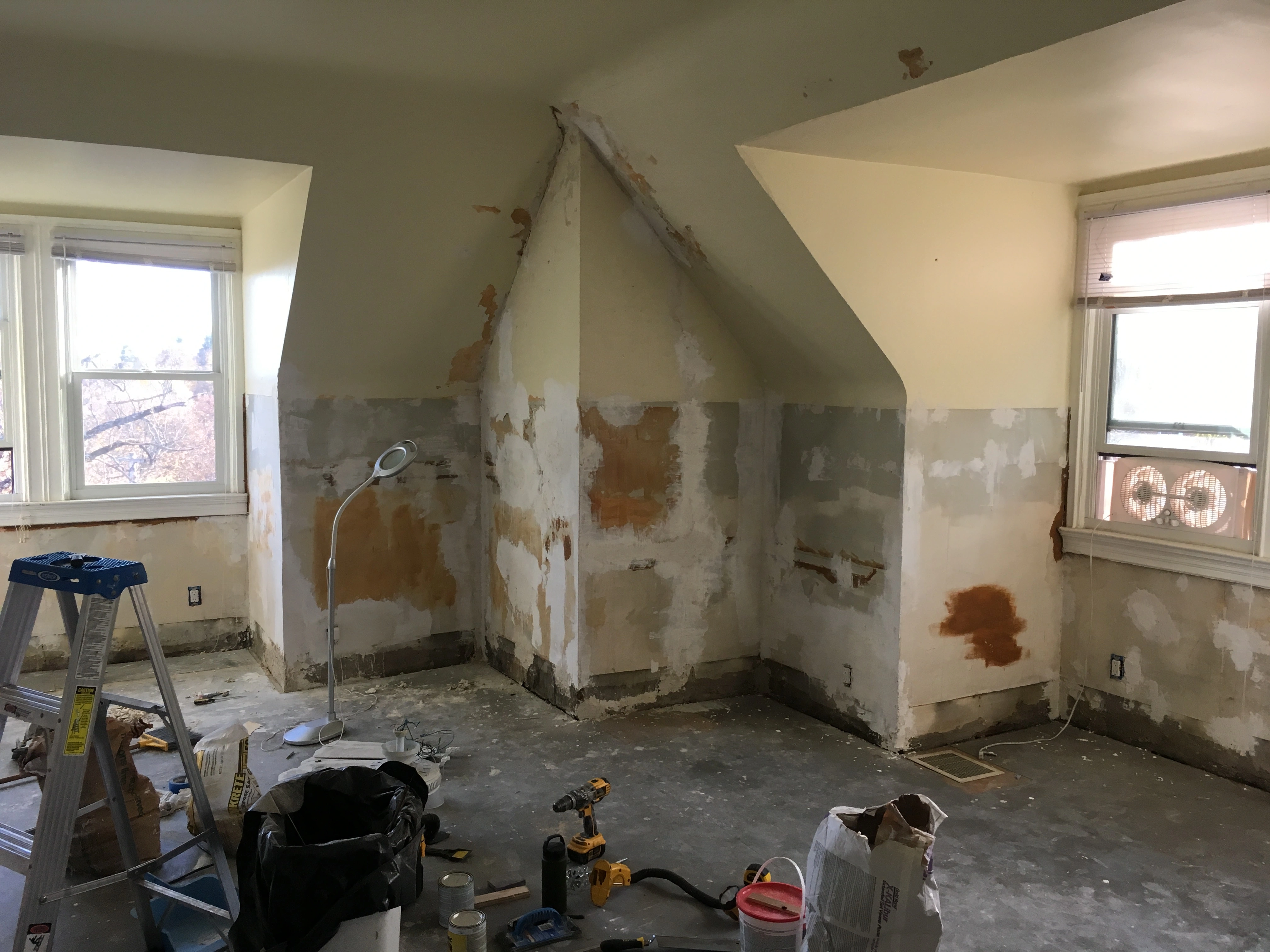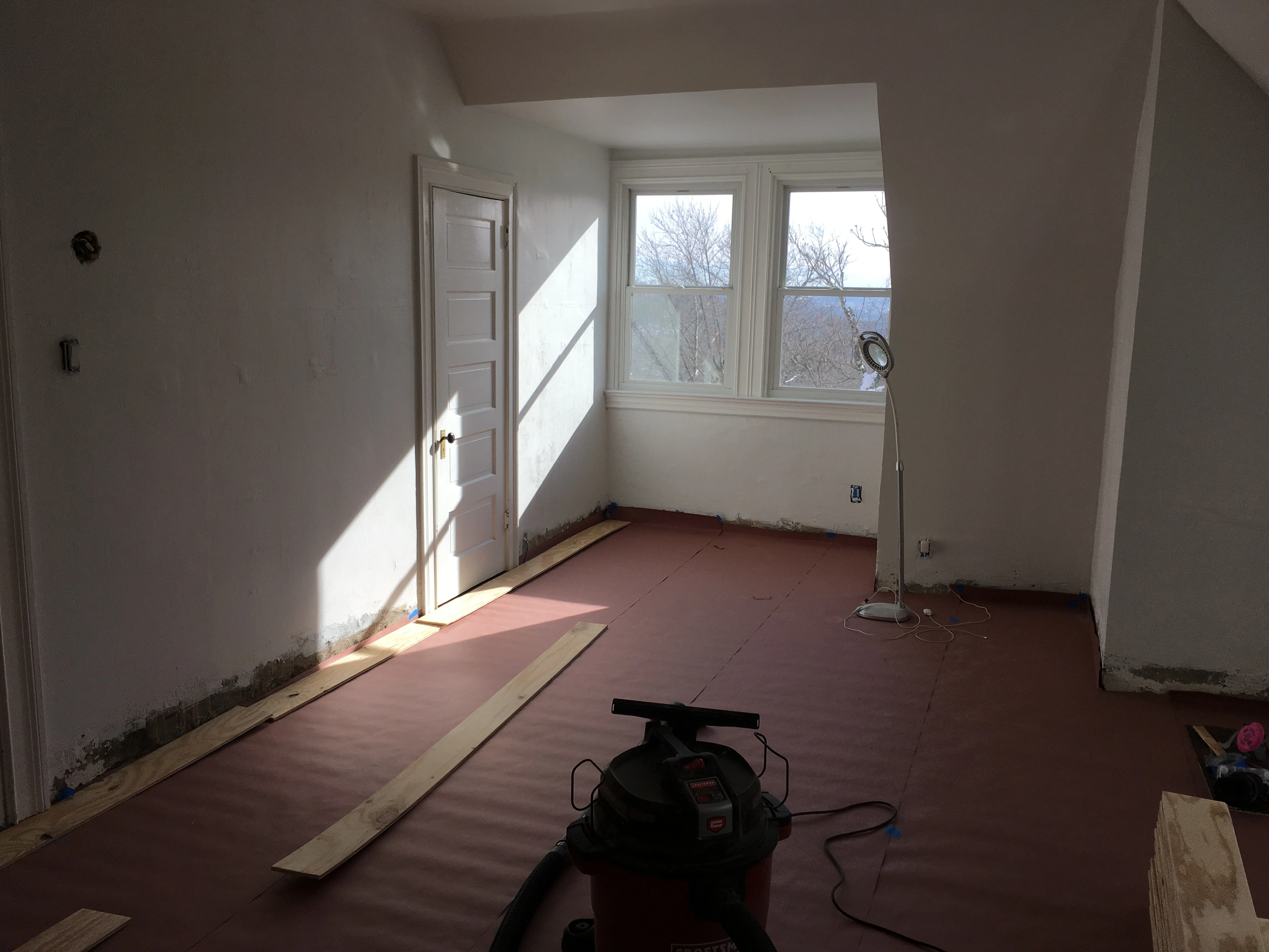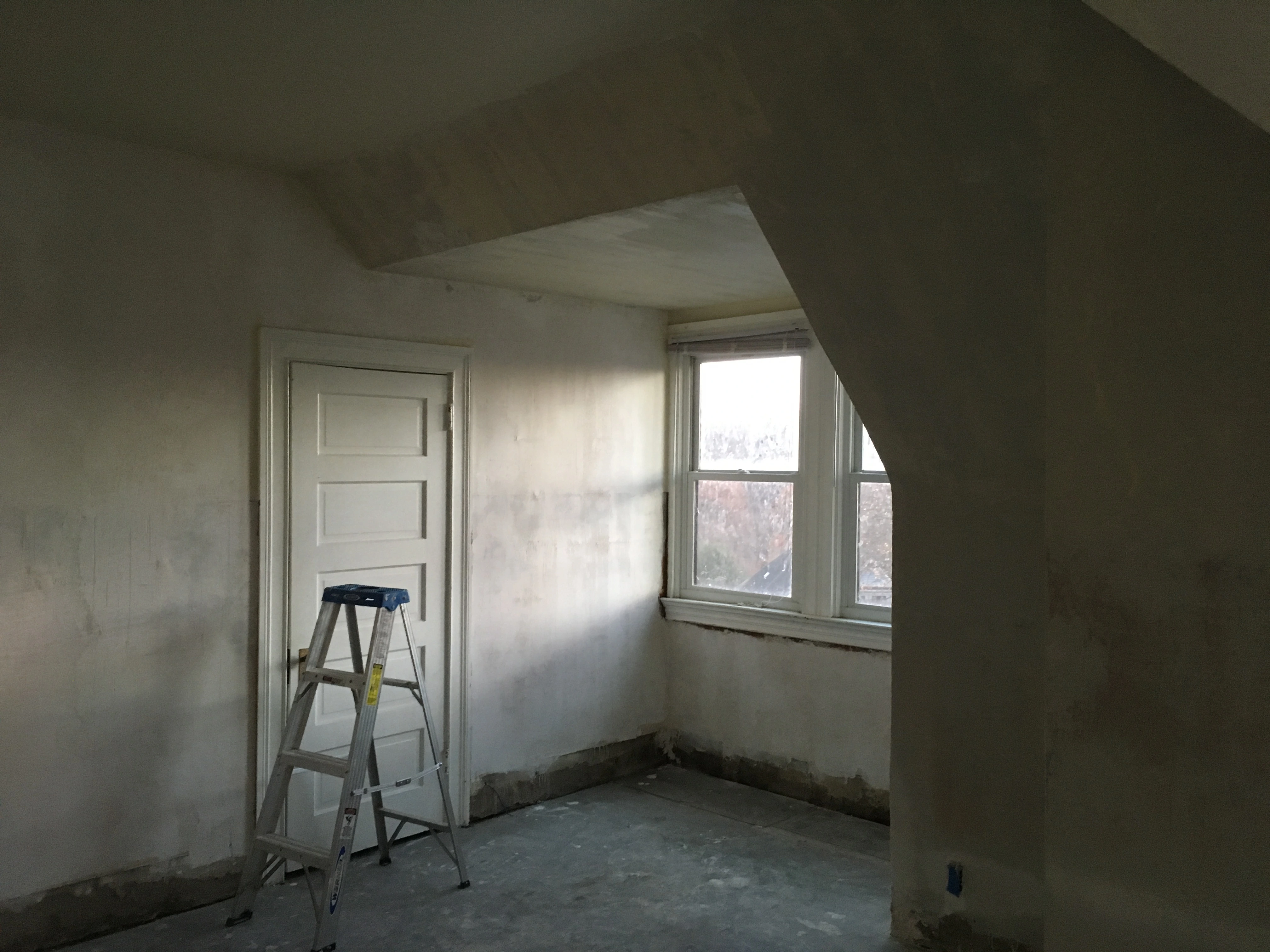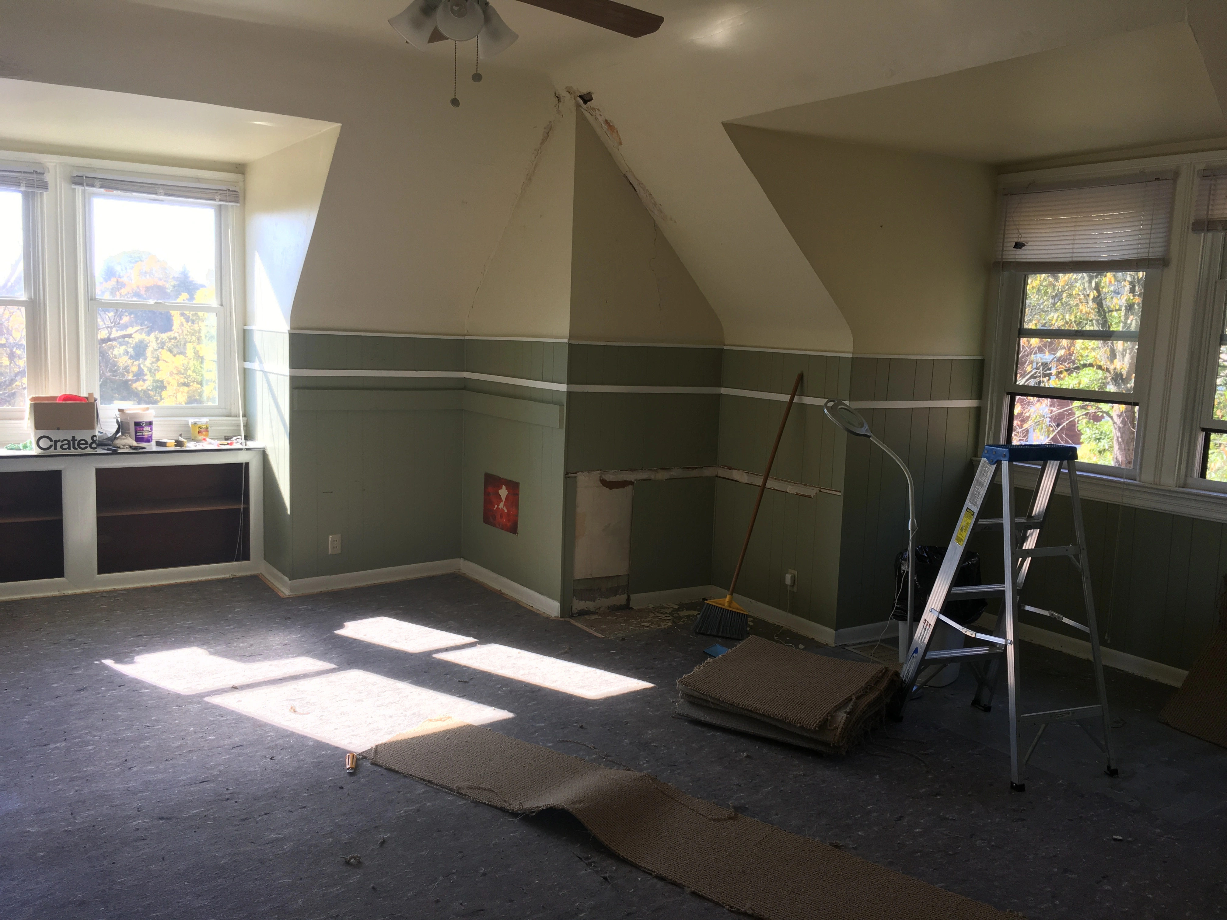 The first thing we're going to do is some wall repair and painting, and then rip up the carpet and do something with the plywood sub-floor. There's hardwood beneath it, but, unfortunately, there's also a nice layer of lead paint that we're not excited about messing with.