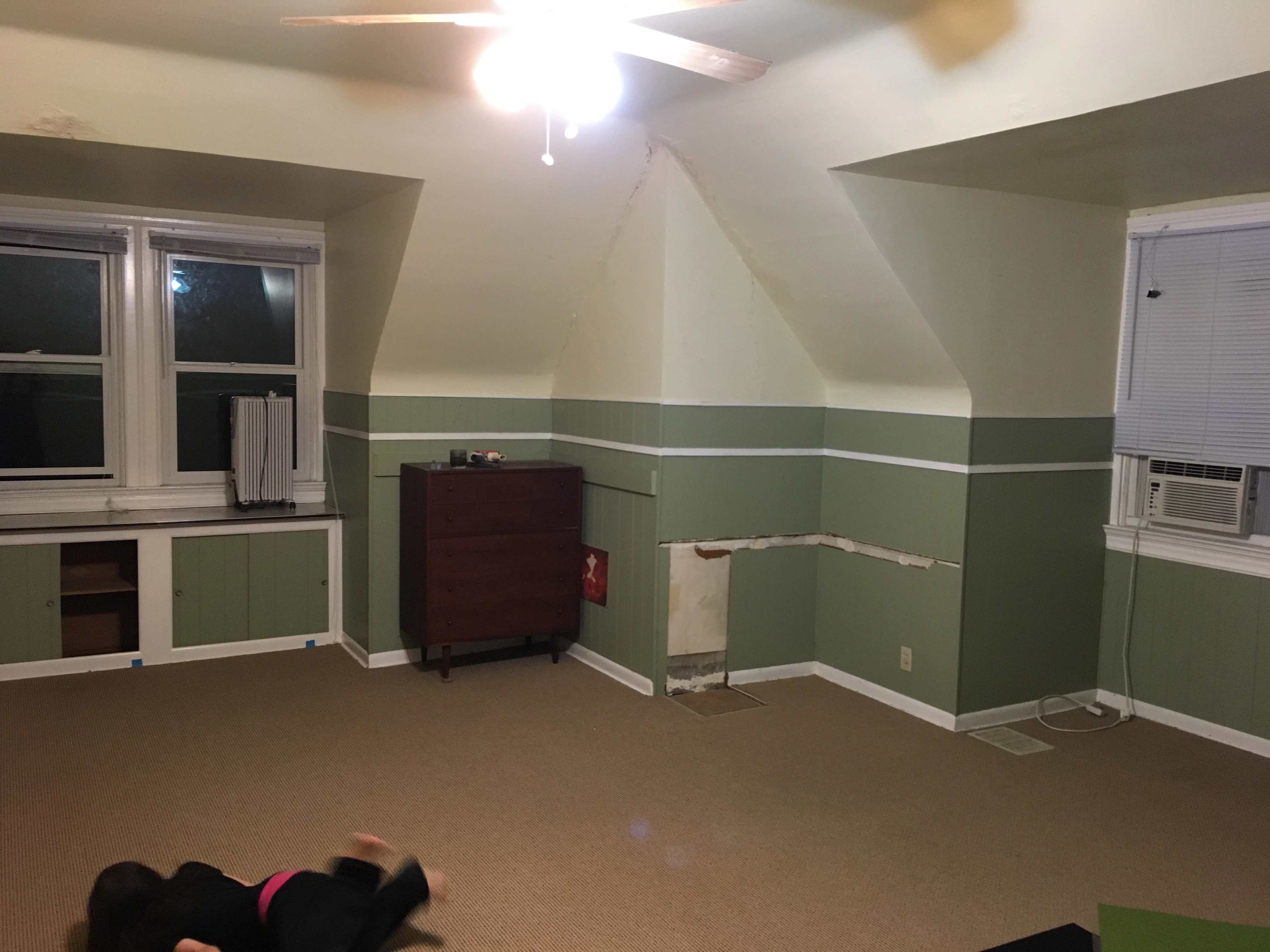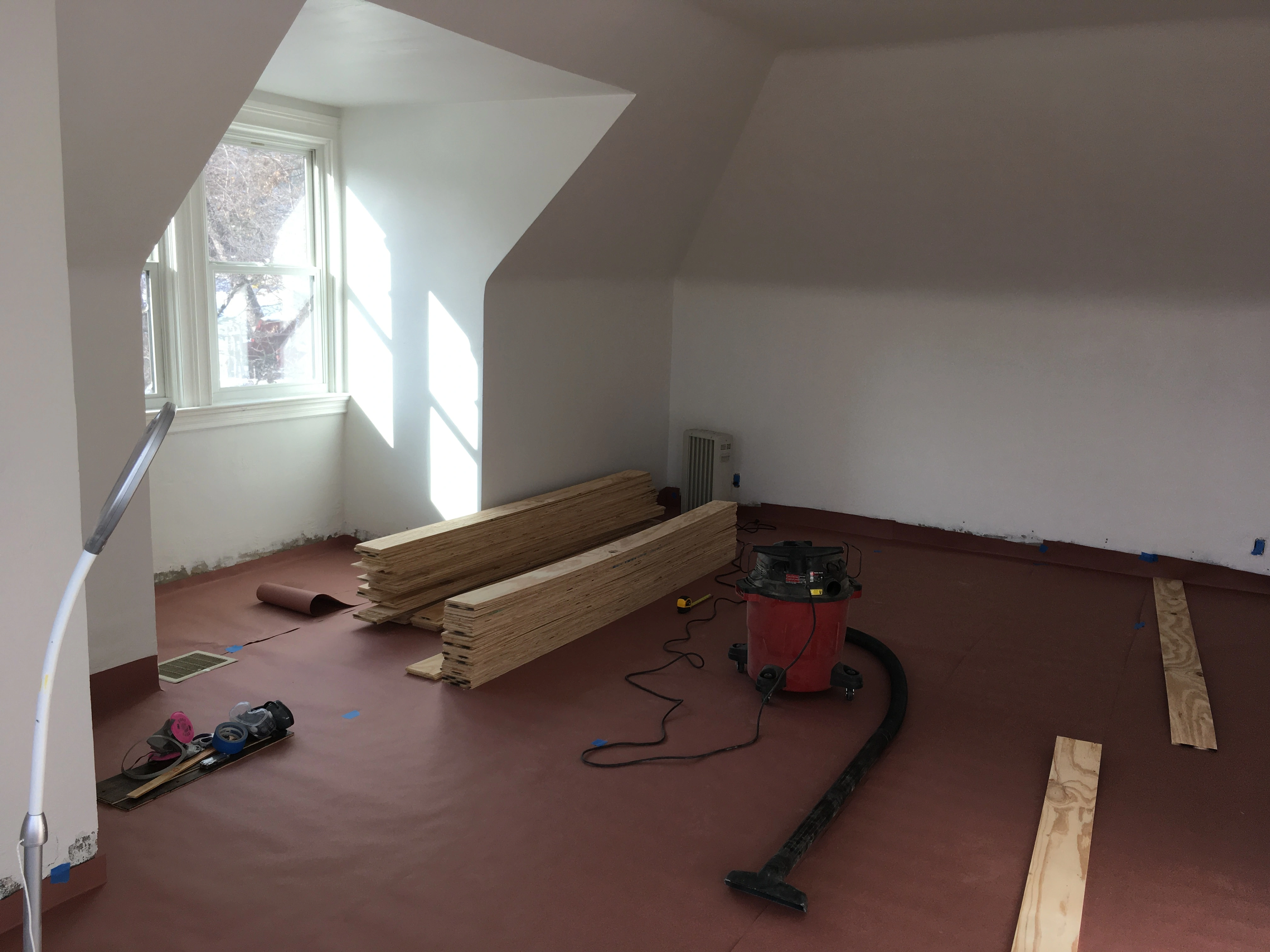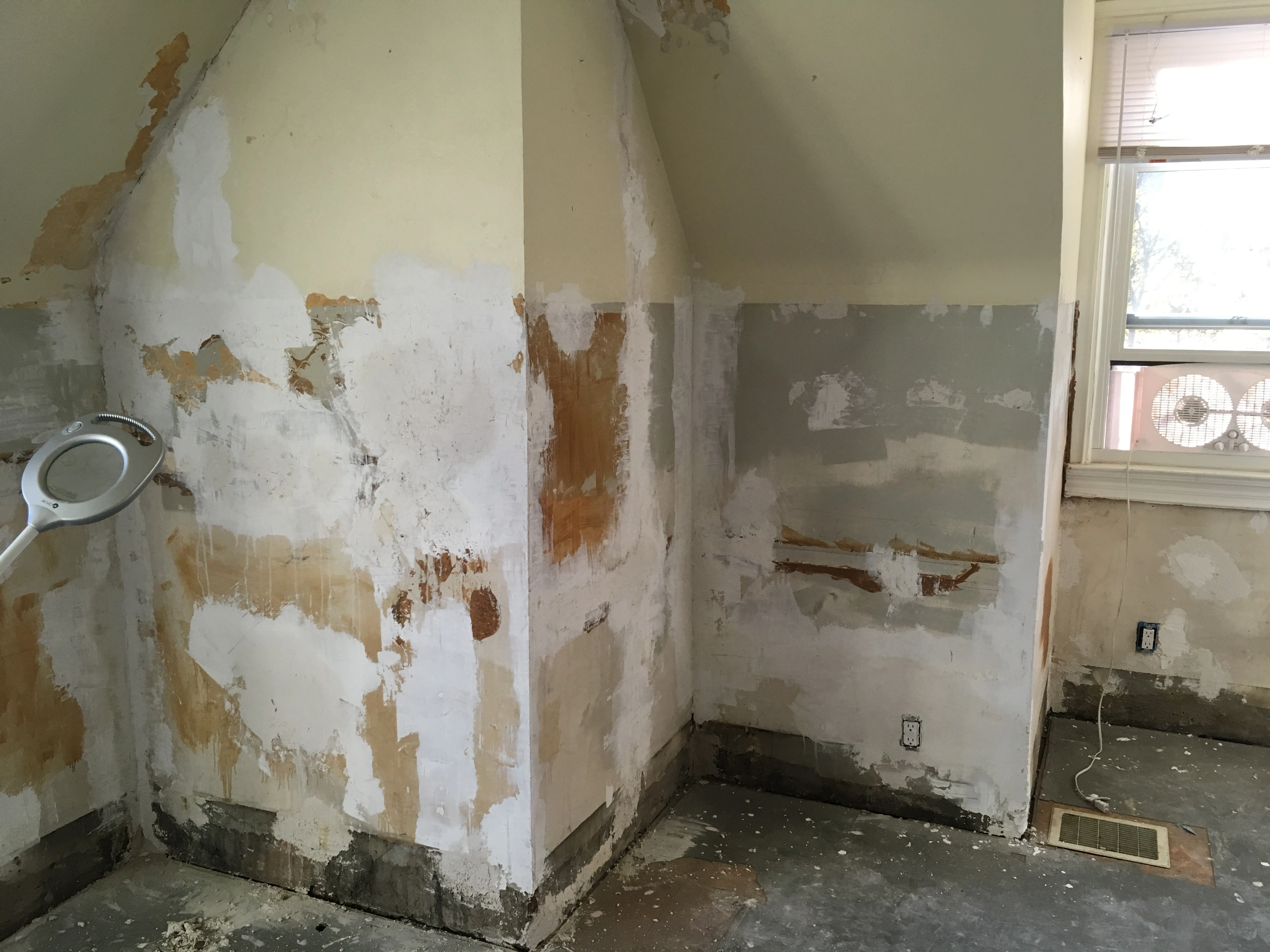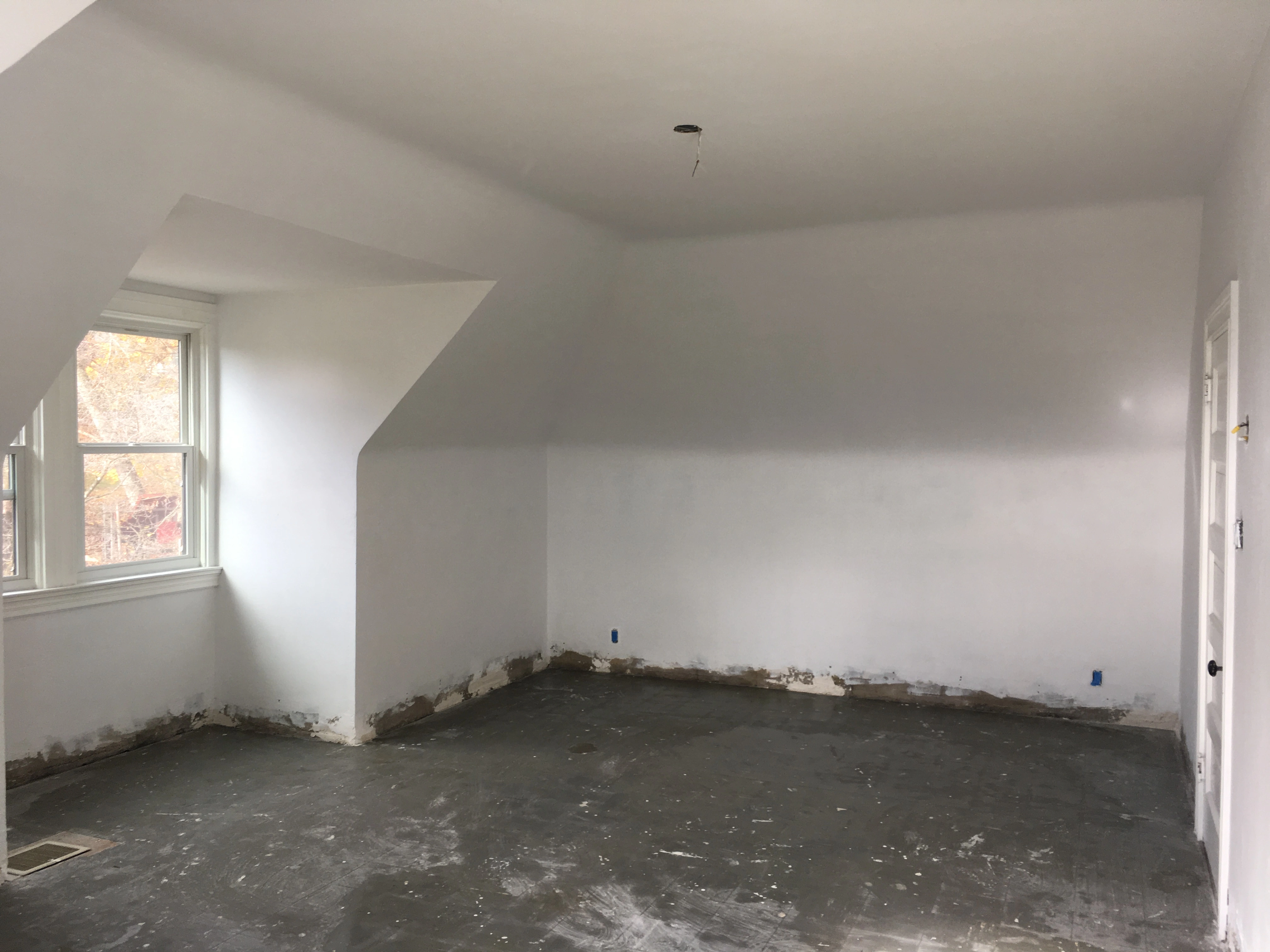 The first thing we're going to do is some wall repair and painting, and then rip up the carpet and do something with the plywood sub-floor. There's hardwood beneath it, but, unfortunately, there's also a nice layer of lead paint that we're not excited about messing with.