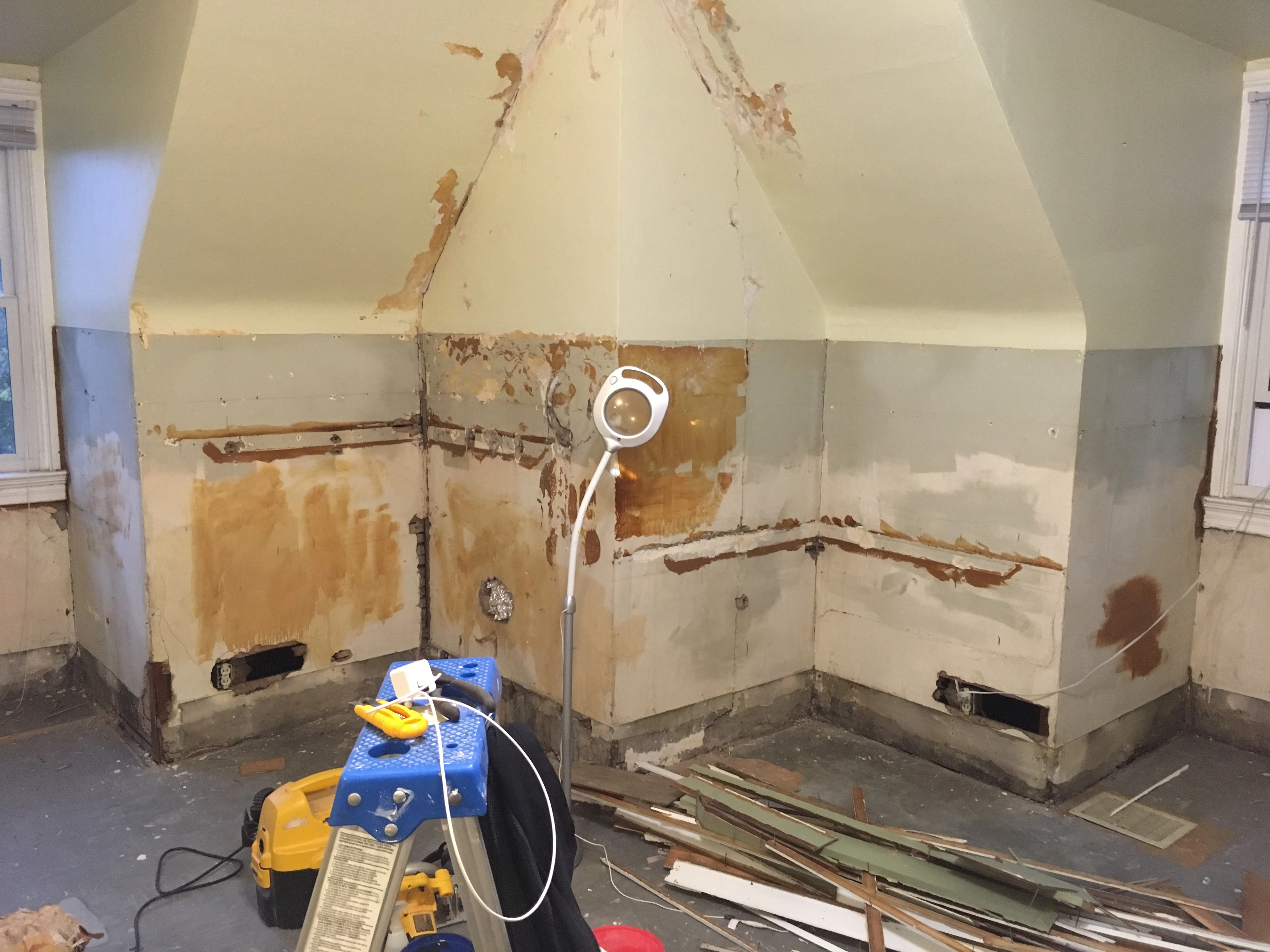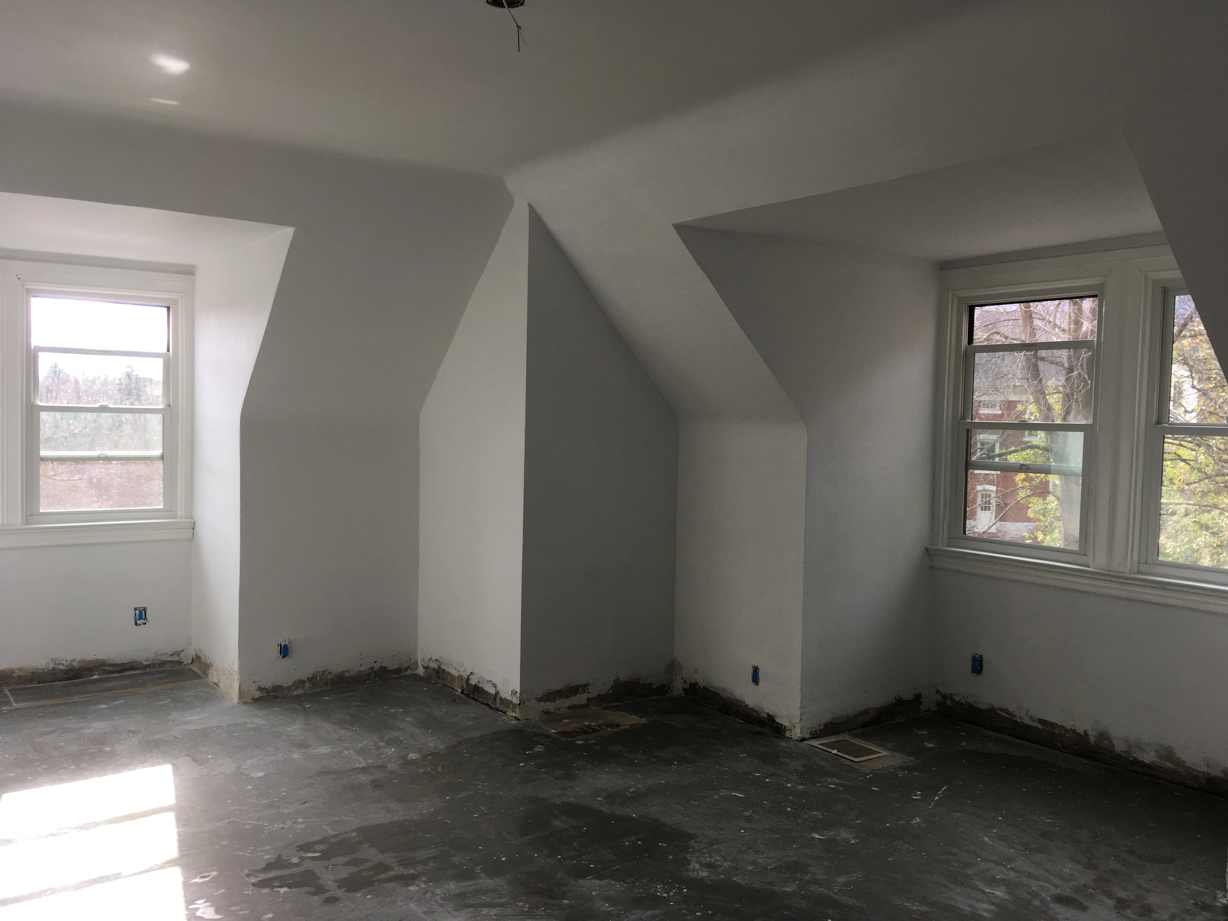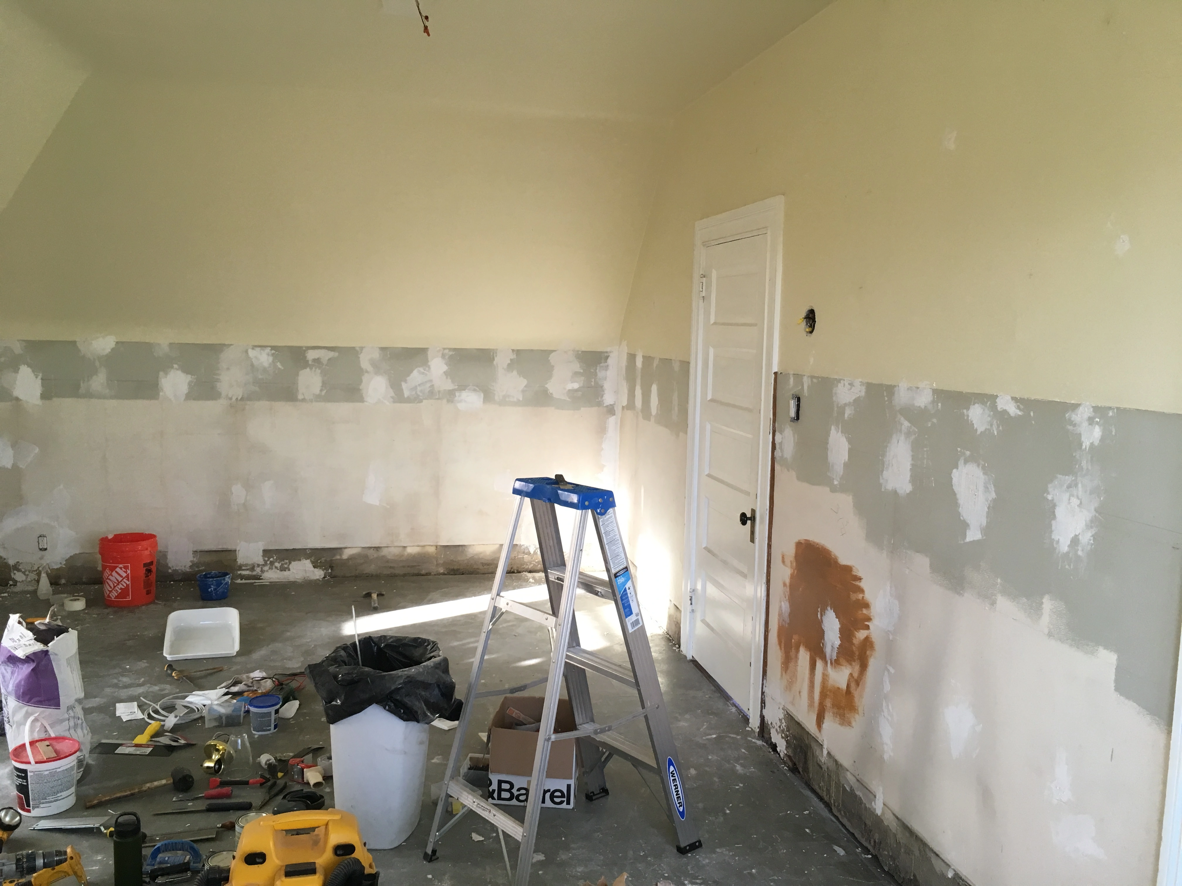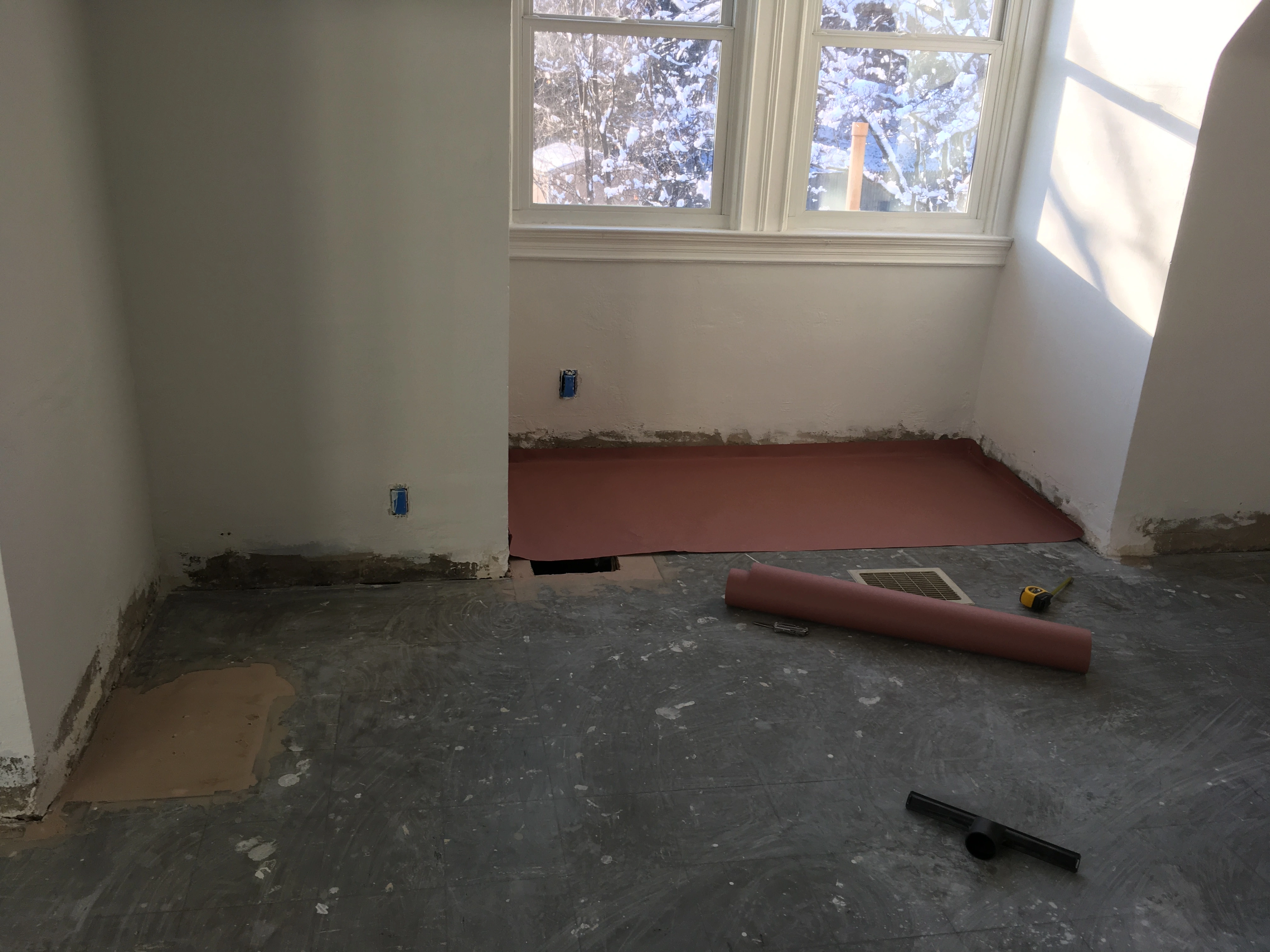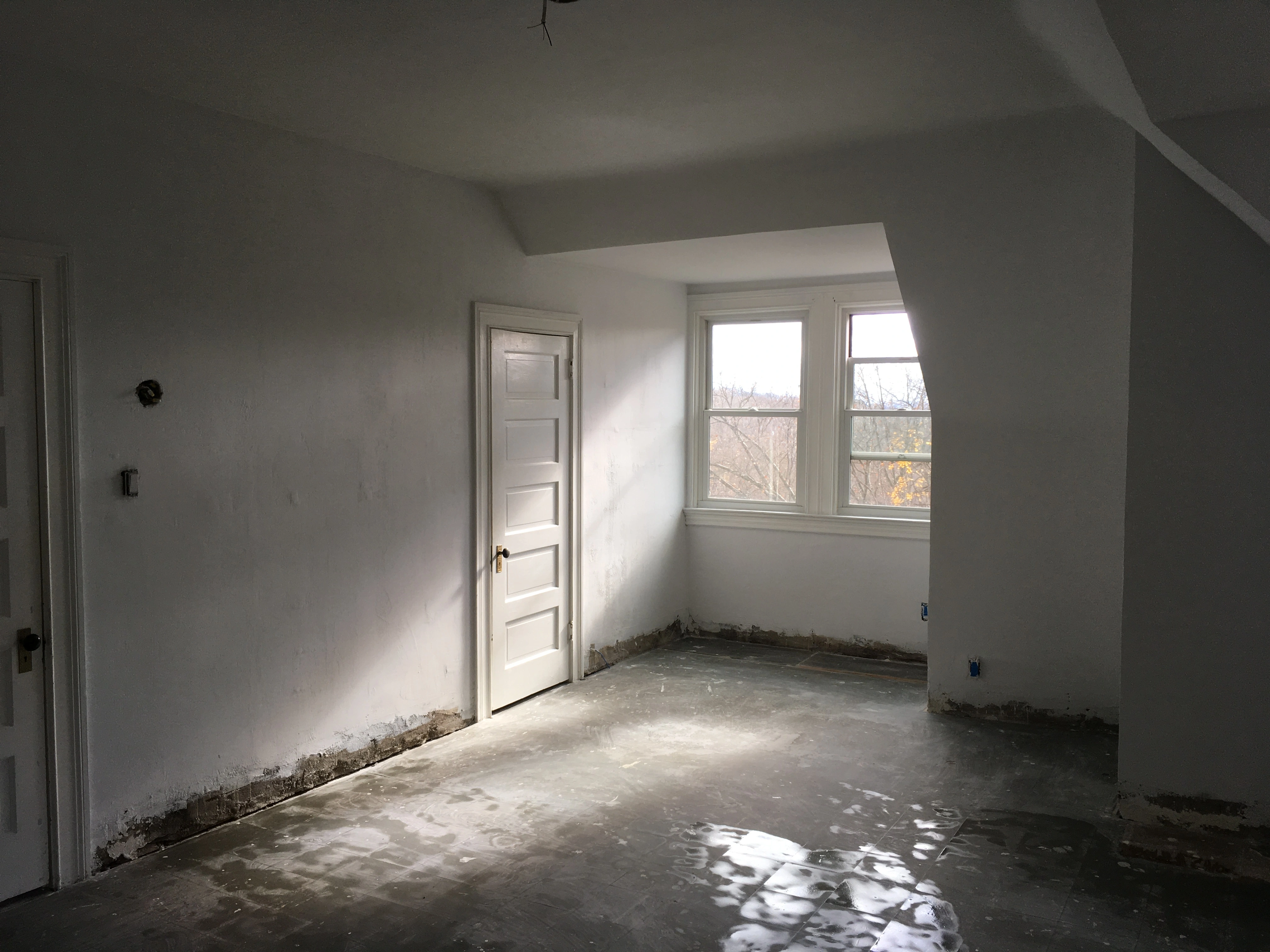 The first thing we're going to do is some wall repair and painting, and then rip up the carpet and do something with the plywood sub-floor. There's hardwood beneath it, but, unfortunately, there's also a nice layer of lead paint that we're not excited about messing with.