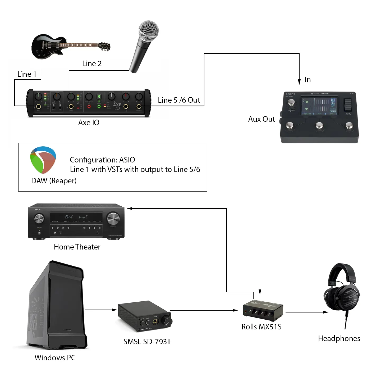 I currently own an Axe I/O for use with my guitar (Line 1) and mic (Line 2). I use the amp out (Out 5/6) on the Axe I/O to route to a Singular Sound Aeros Loop Pedal. The looper has an aux out that runs to a Rolls MX51S which mixes my PC Audio as well. PC Audio is from an Optical out on motherboard to a SMSL Sd-793ii then to the Rolls MX51S. The Rolls then outputs to my Home Theater (sometimes I share my computer audio throughout the apartment). Attached is a visual representation of my setup.