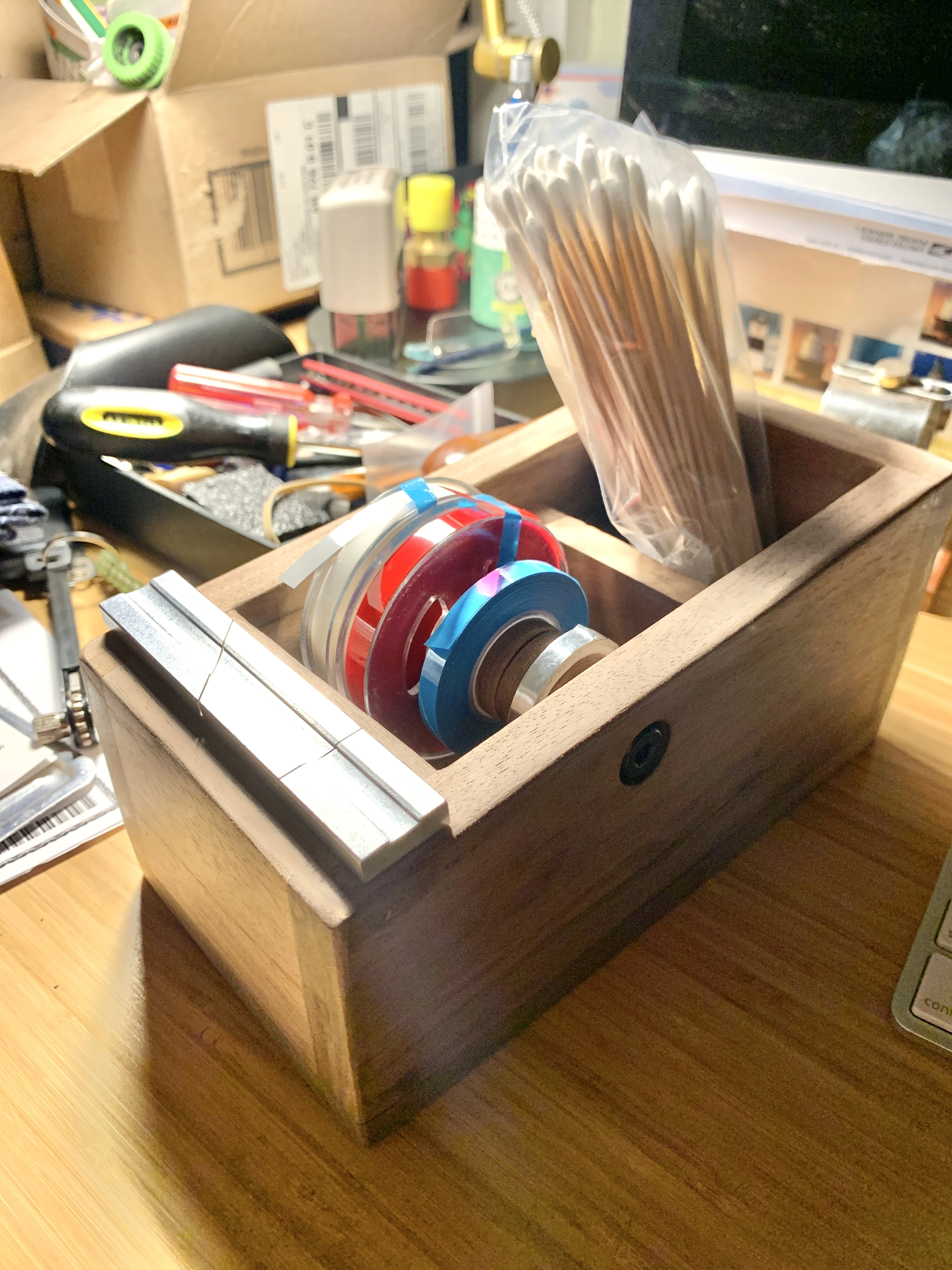 Been looking for one of the old 3m ones that we used to use in the studio, but none to be found and if I could, they go for a lot of $$! So… I made my own that fits my little 3” reels. I designed it to fit a little alcohol pump dispenser in the back with swab storage for cleaning too! Black walnut I had left over from doing the sides for my 388. I’ll get a satin poly finish on it tomorrow.