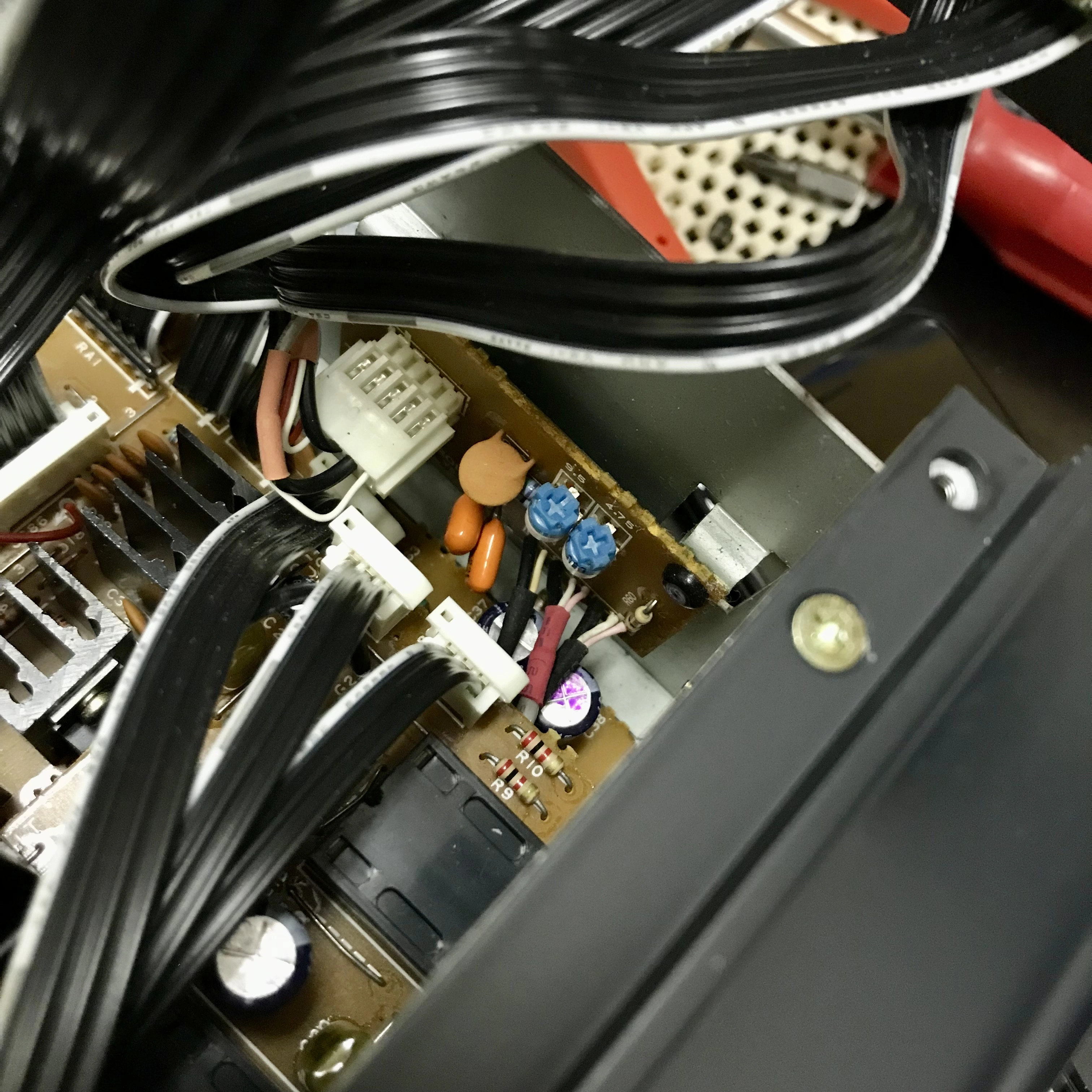 The one toward the rear is labeled 9.5, the one toward the front is labeled 4.75. Those numbers represent centimeters per second…those numbers are the metric equivalents of 3 3/4ips and 1 7/8ips. Those are the tape speed adjustment trimmers. So you could put a calibration tape in the machine with a known frequency tone, press PLAY, put a frequency counter on the output (many DMMs have that functionality), and do this in high speed and low speed and adjust the corresponding trimmer to dial the output frequency to the known frequency on the cal tape. So at least we can do that lol. There are trimmers all over the machine, down on the motherboard below the transport amp cards, on the amp cards, and on the SUB modules. I’m hoping over time to ascertain what’s what.