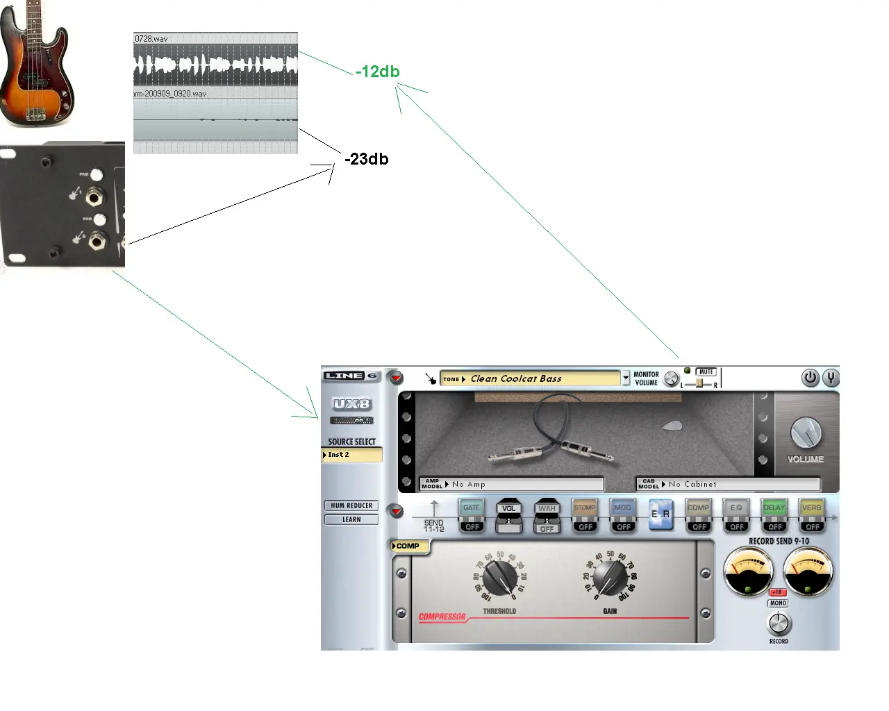 , with the software ON and no fx/ no plugins I could easily get over -12 to -6. a nice fat large wave form...