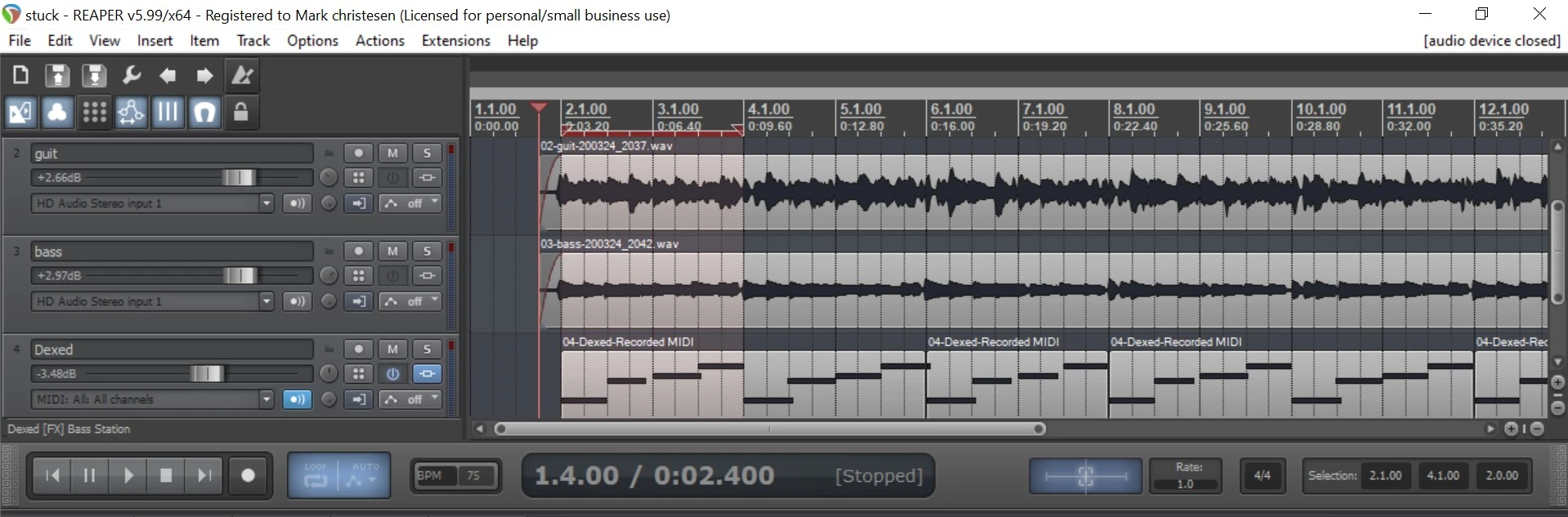 Falling out of time with what? There is no reference to time unless you're talking about tempo... if so, no real means to measure tempo unless I pull out a metronome... Which I ain't doing.