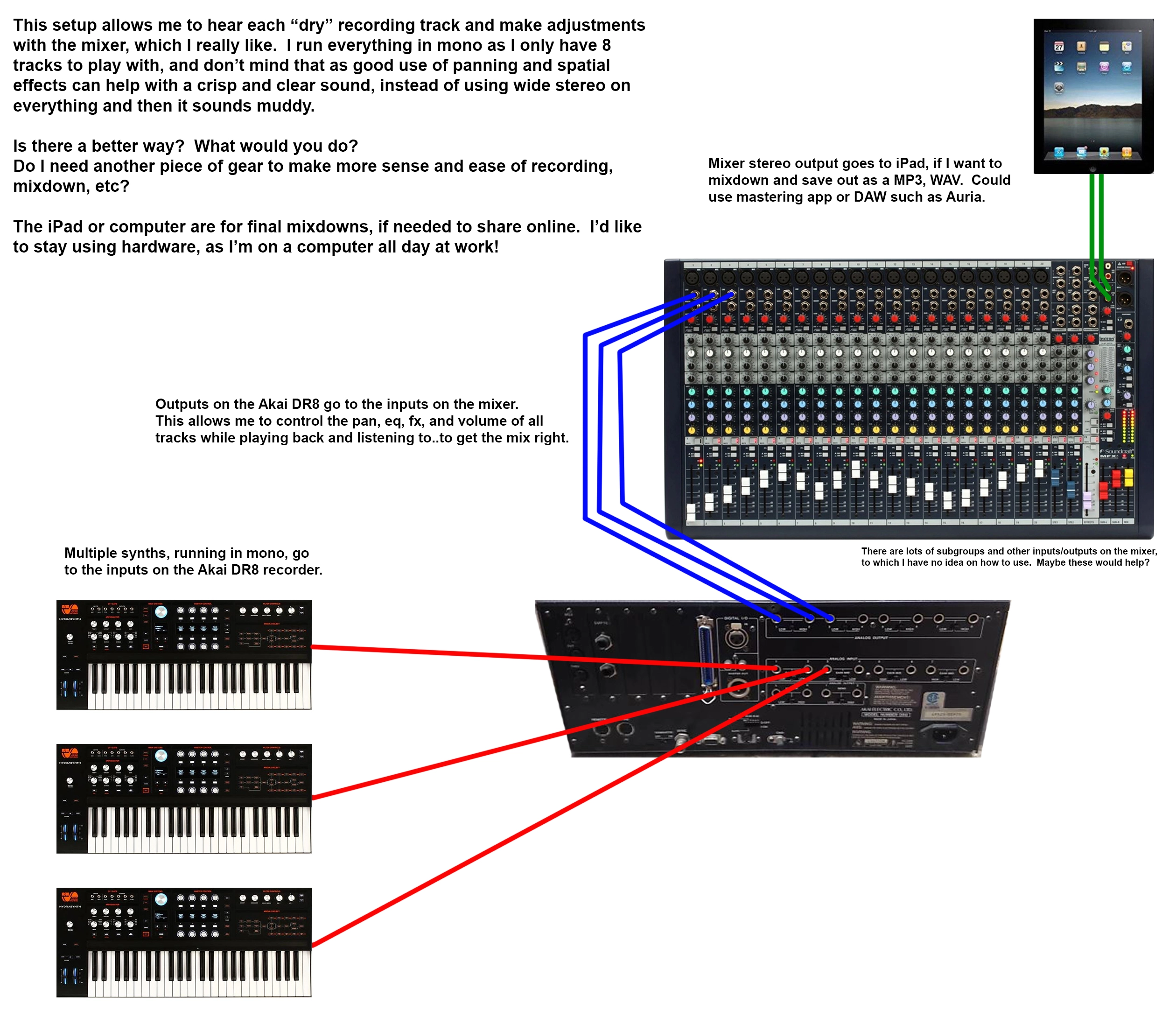 I wanted to be able to record tracks..one at a time, and then mix the song using the mixer as a tool (in regards to eq, volume, etc).