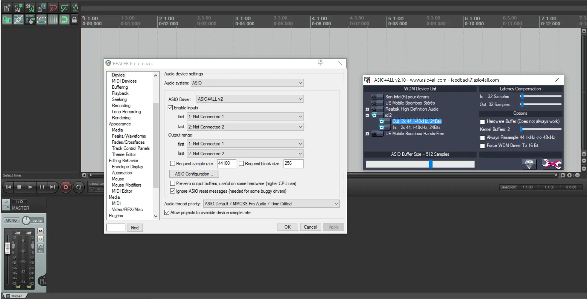 The problem is that I can't get it to work with the Reaper software with Asio4all drivers (it doesn't seem to have any specific Asio driver for that sound card). The iO2 seems to work properly with direct-sound configuration, but as you can guess the latency gets horrible when it's about singing.