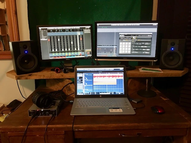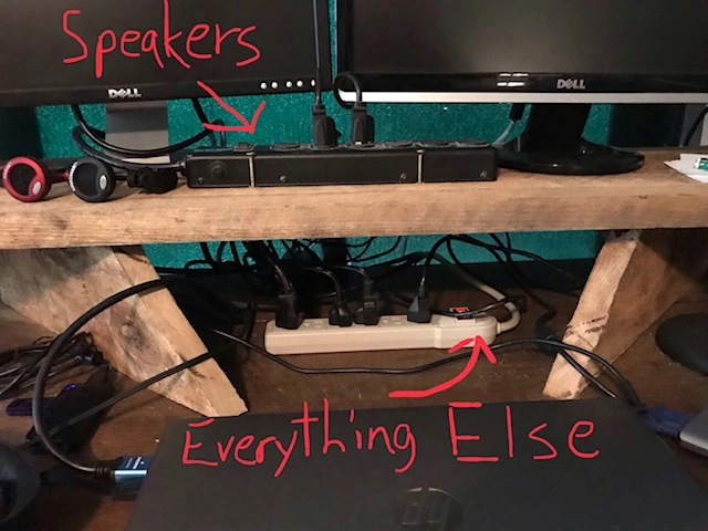 Hey y'all. Just thought I'd share a quick project from a while back that completely changed my little setup from cluttered and unorganized to neat and tidy in about 30 minutes. Like most newbs, I was tired of my huge mess of cables all over the place, tired of my speakers being way below head level, tired of my monitor screens being covered up by my laptop, etc., and tired of reaching behind both my speakers to find the on/off switch every time I wanted to listen with headphones...