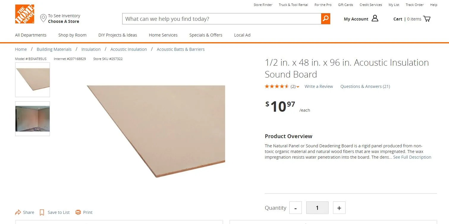 Not sure if the Home Depot stuff is the same, but what I'm familiar with is Homasote and is commonly found in good lumber stores. Neither my local Lowes or Home Depot stocked Homasote or an alternative, but was able to find it at a local 'real' lumber/building goods supplier.DON'T USE DRYWALL ...The drywall concept will totally help but THIS will increase the resulting sound deadening much more.