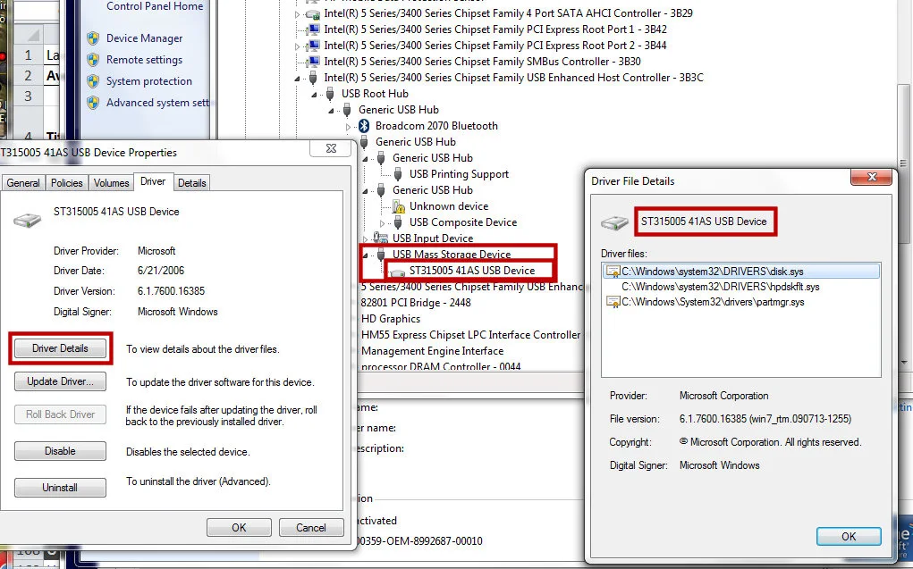 Notice that in that photo, the actual device—the ATA hard drive—is not visible in the device tree. The only thing you see is "ST315005 41AS USB device". In this particular case, the device name happens to be similar to the name of the SATA drive beyond it, but what you're seeing there is the USB-to-SATA bridge. If you use some other bridges, such as an Oxford 912 with the stock firmware, you'll typically see "Oxford Semiconductor" there, and the OS will have no idea of what the hard drive beyond it is. The only reason you see anything Seagate-specific at all is because Seagate provided a custom firmware image for its USB-SATA bridge that was programmed to call itself a "ST315005 41AS USB device".