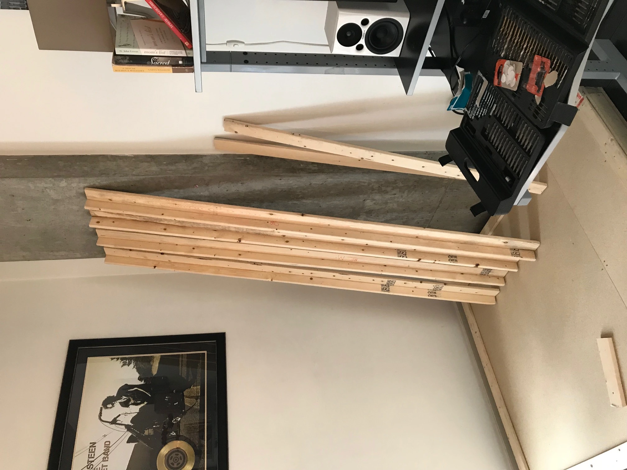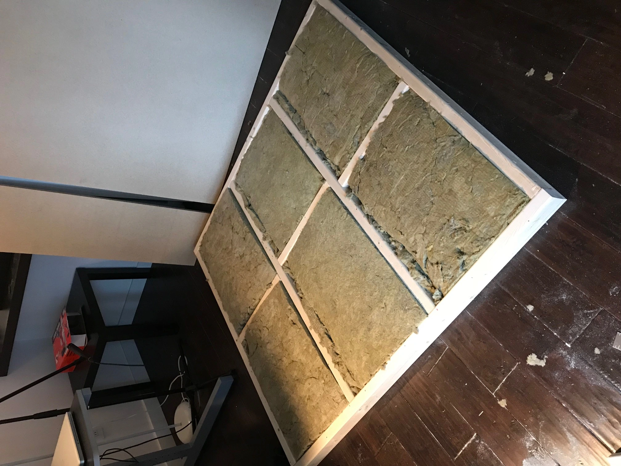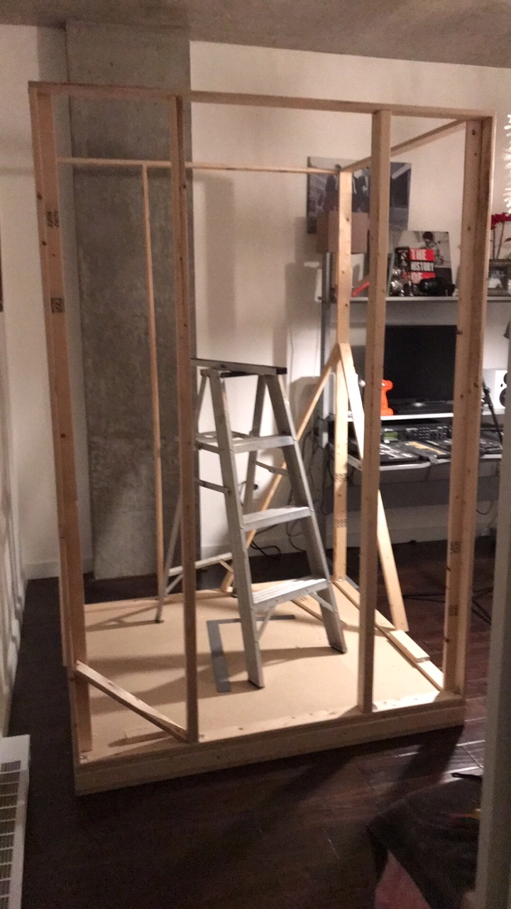 I live in a condo, and looking to build a non permanent booth. The purpose is to keep my vocals quiet and not disturb the girlfriend, and to a lesser extent the neighbors. Creating a non closed vocal spot, or using a closet is not an option. My singing is too loud. Also, I want to keep my place looking nice. So I figure after this is all painted white, it won't be an eyesore.
