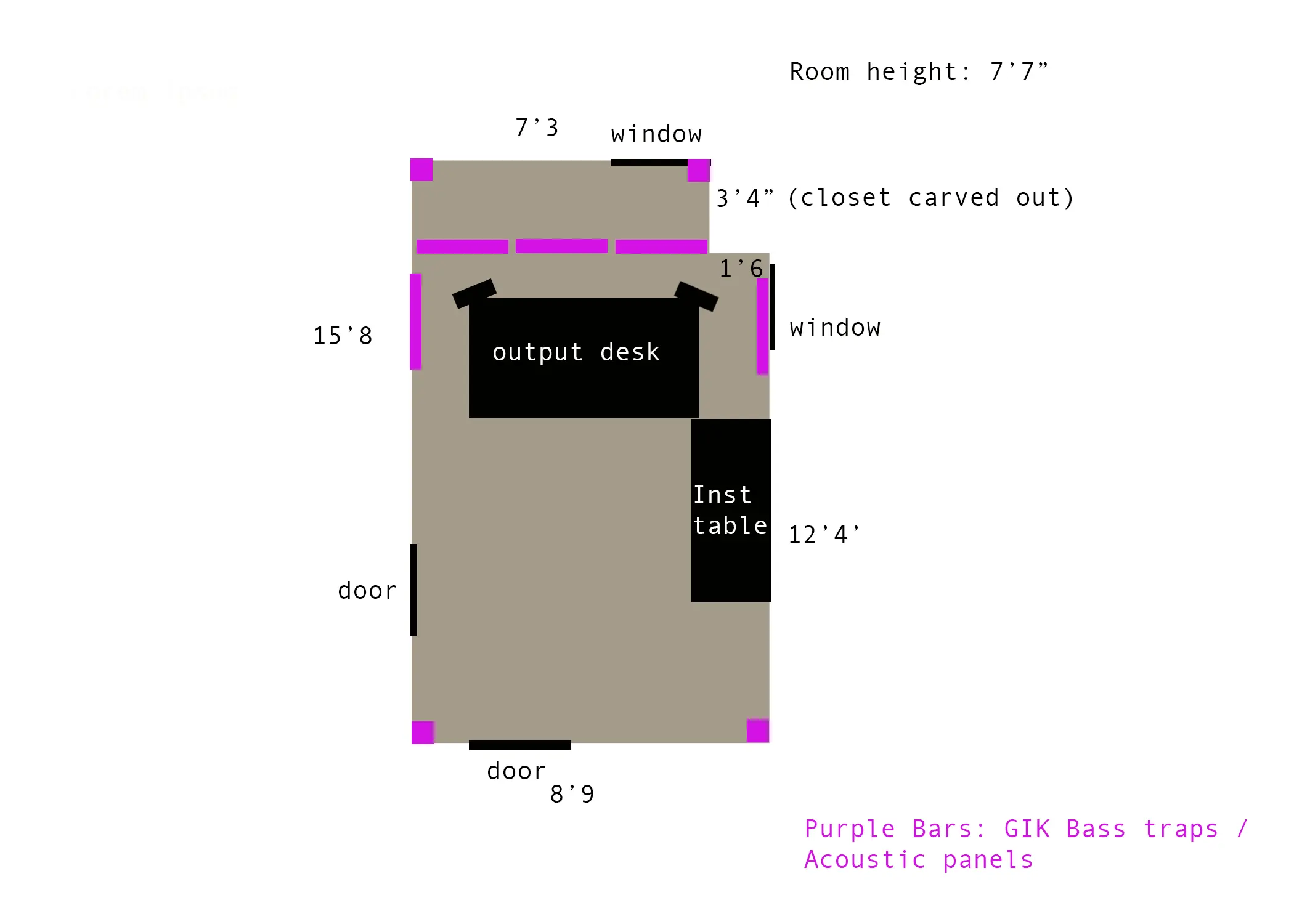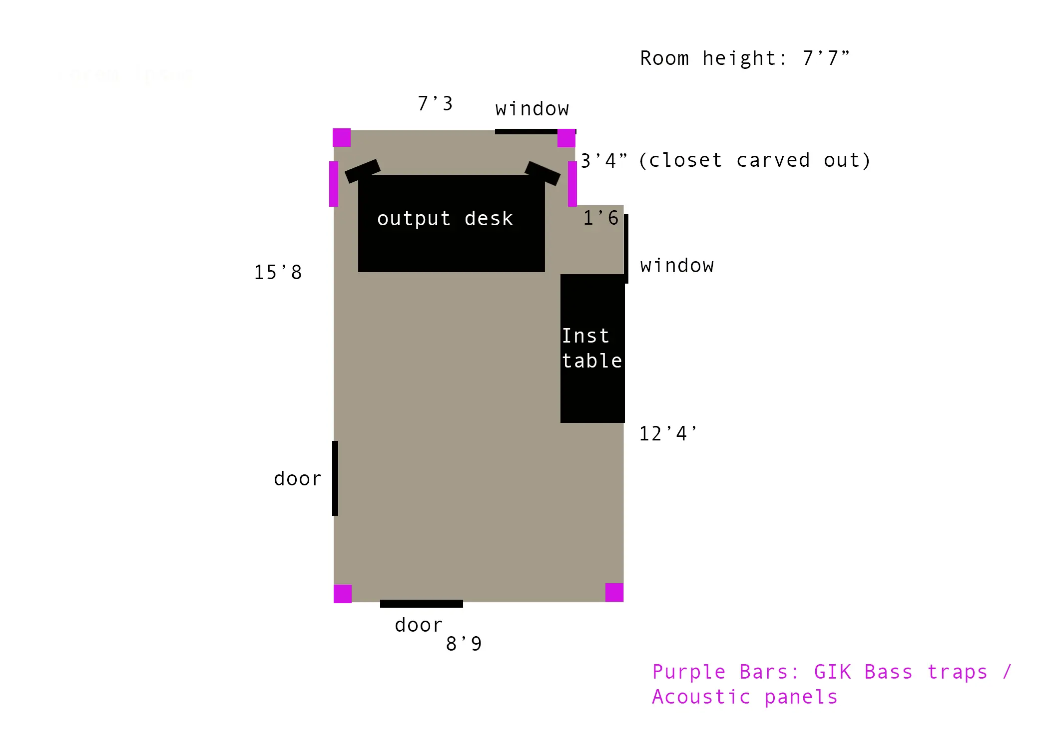 Longtime lurker/ first time poster. Moved to a new house and am trying to make a large bedroom a dedicated studio. I've been searching a lot of peoples posts and haven't quite seen the shape of the room I'm working with, in that it's juuuussst short of a perfect rectangle. There's a closet jetting out of one of the corners, just big enough to be a problem but small enough where it might be work-able. I'm debating where to put my output desk / monitors.