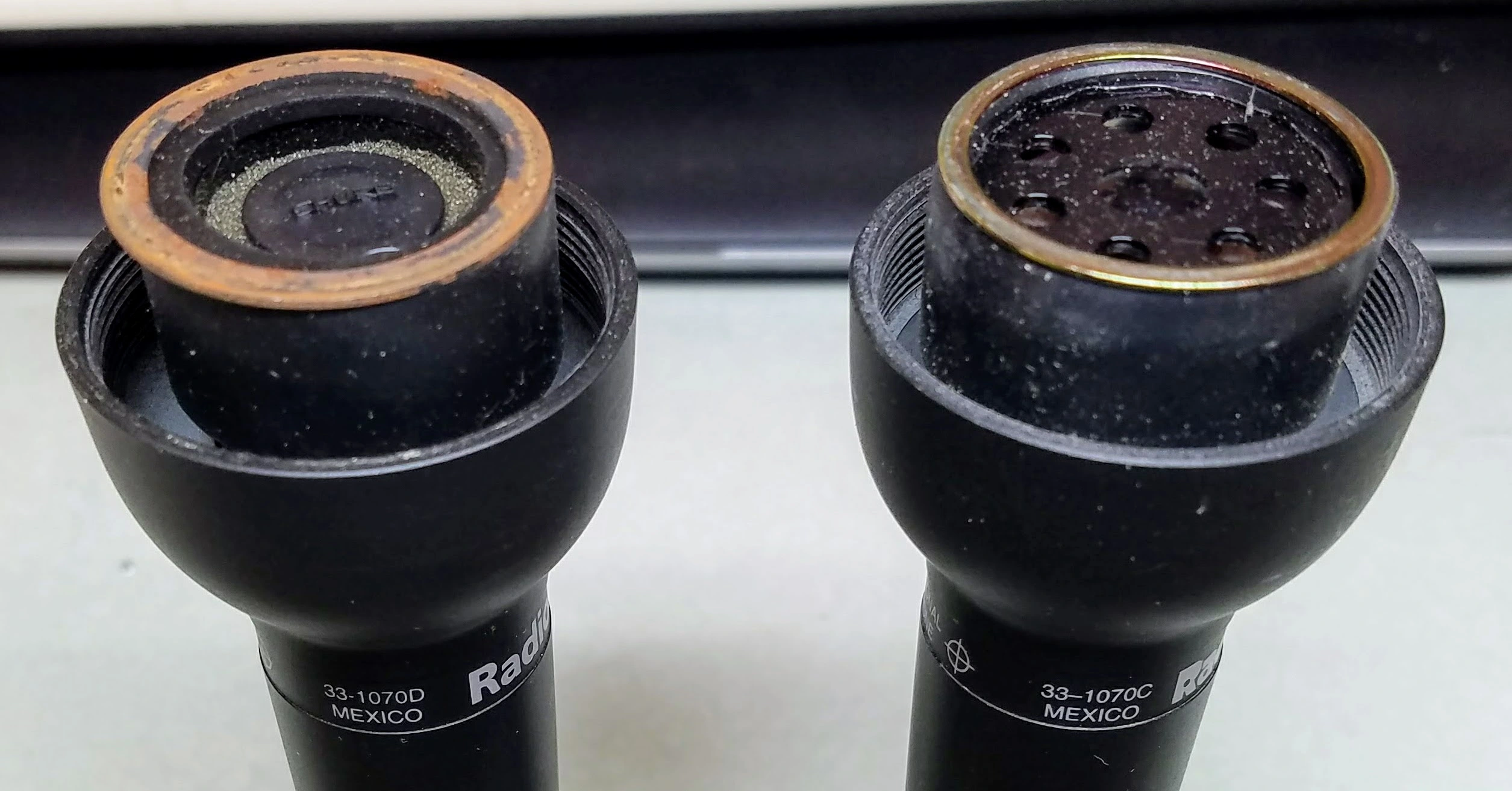 So i put some hot water and dish soap in the ultrasonic bath, dropped the nasty grille in there set for a 20-minute ride, washed my hands, and noticed that it has a completely different element than my other mic, which turns out to be a 33-1070C.