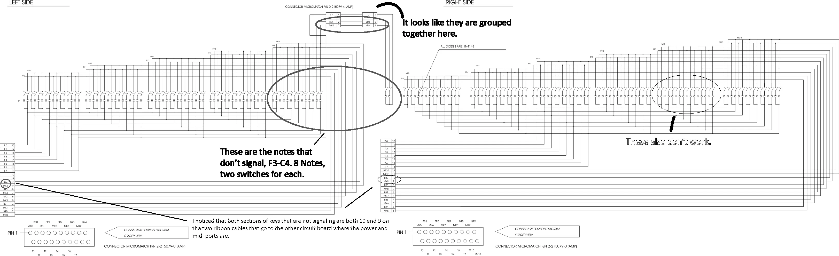 You could try opening the board then re-seating all the connectors for the keybed. If that failed, carefully inspect the contact pc-boards - cold solder joints, cracks, etc.; re-test then if that fails, check out all the diodes with a multimeter.