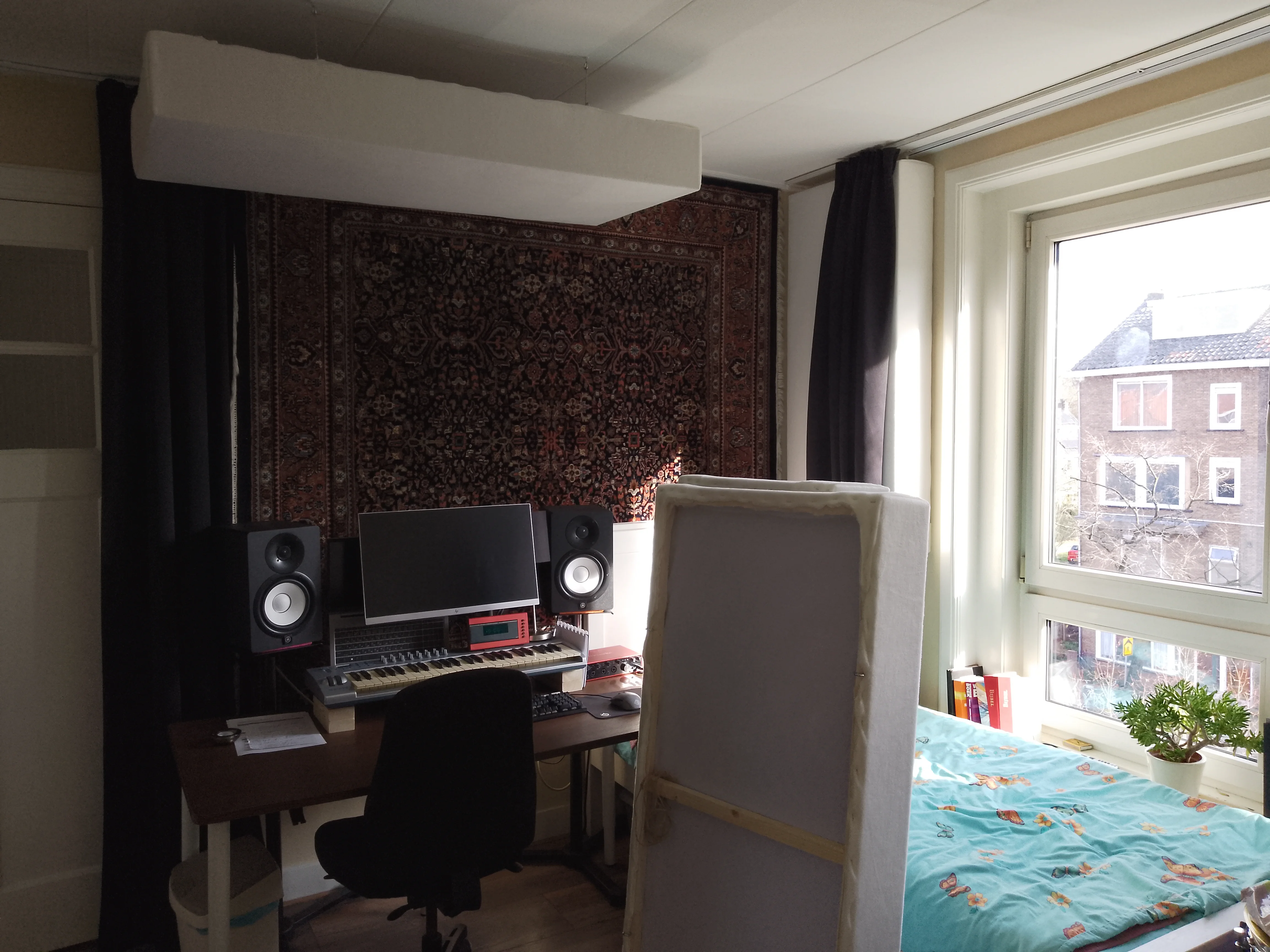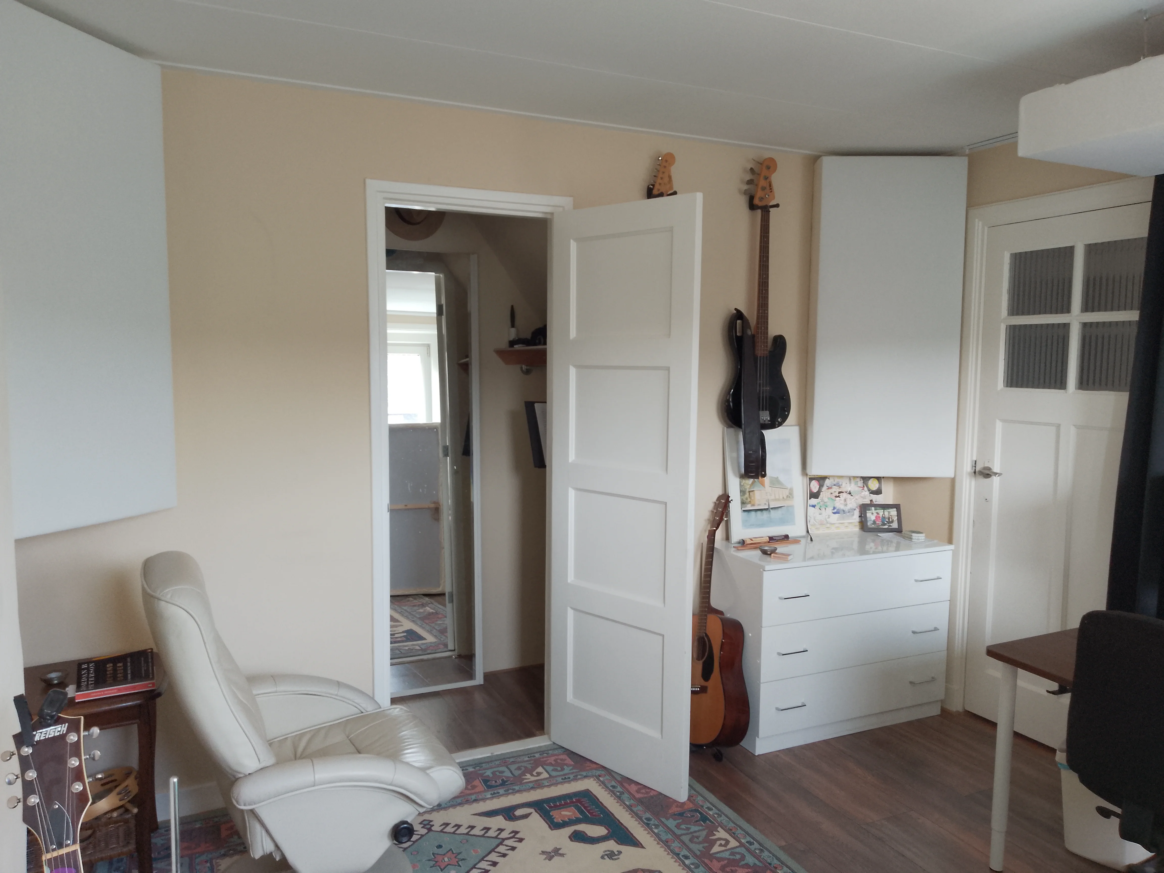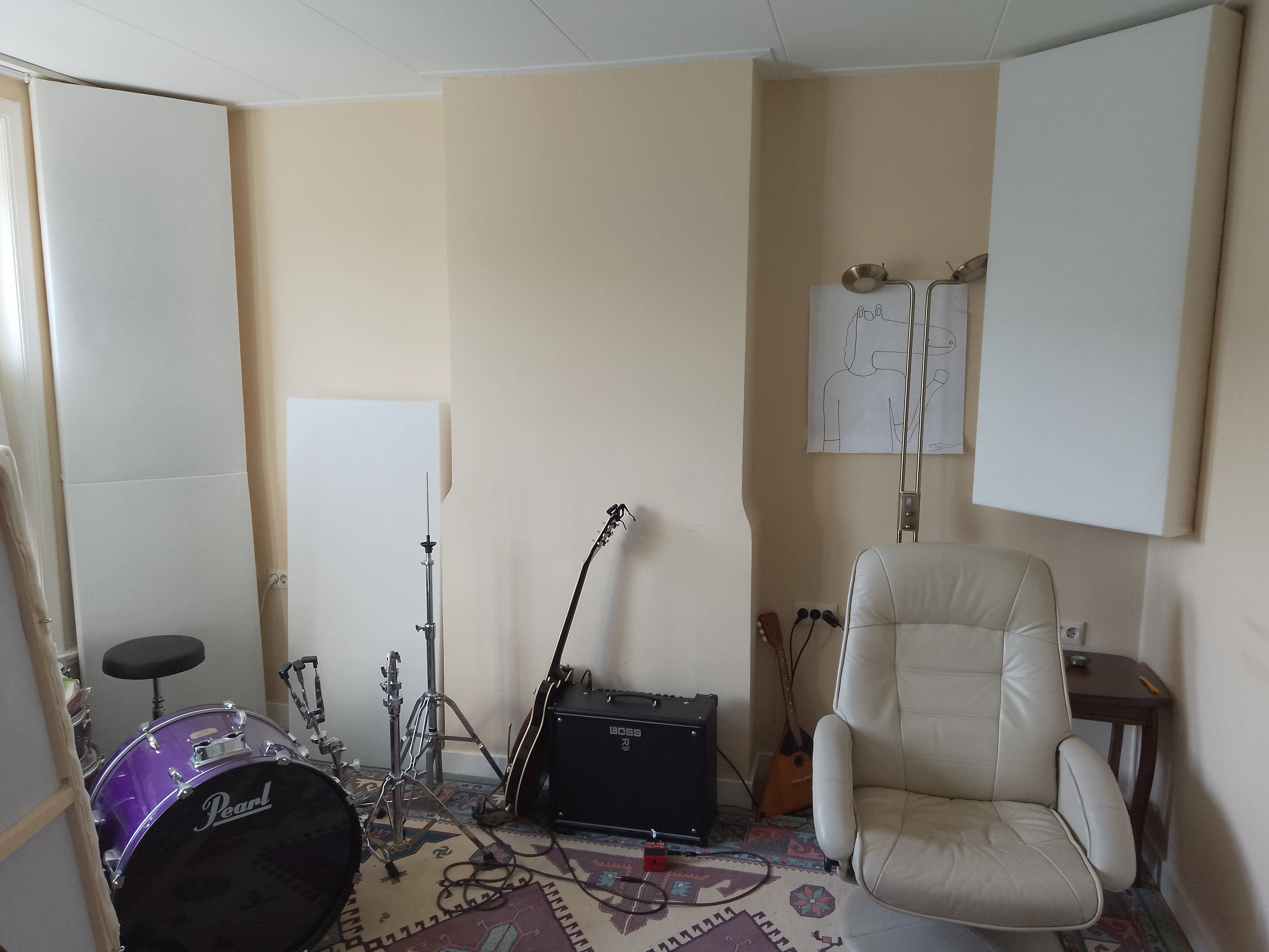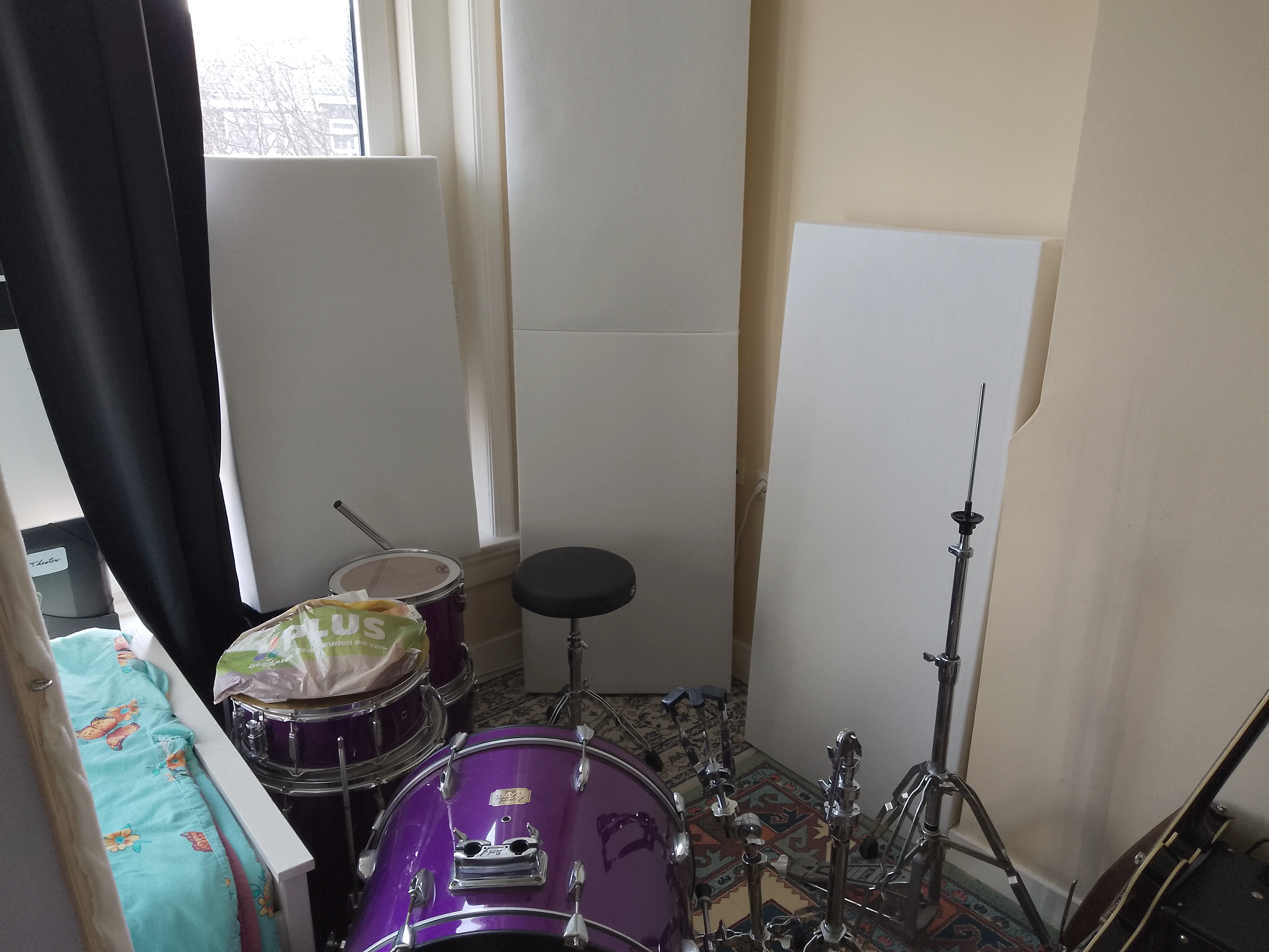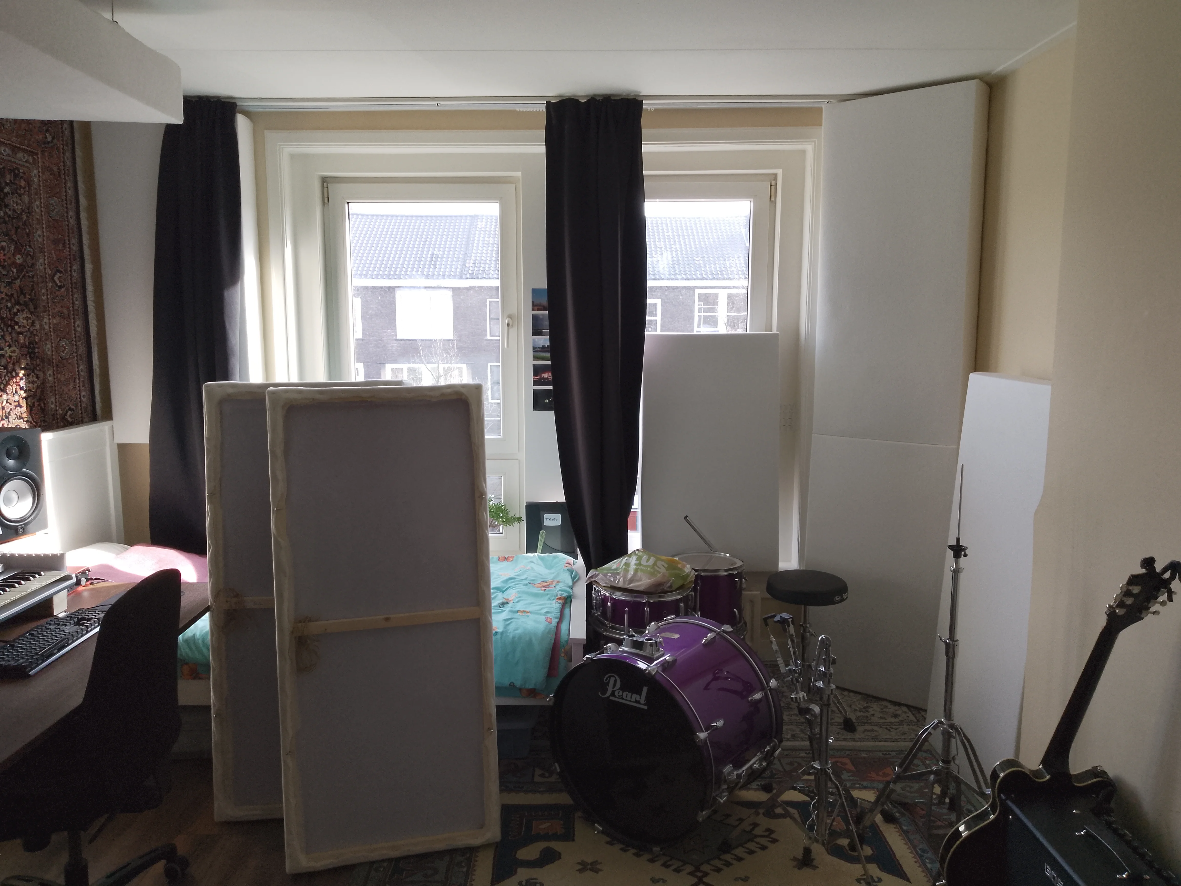 This is my bedroom and the drumkit is yet to be set up by my friend who owns it. The two panels that are not in the corner are just leaning against the wall and are easily movable and stackable.