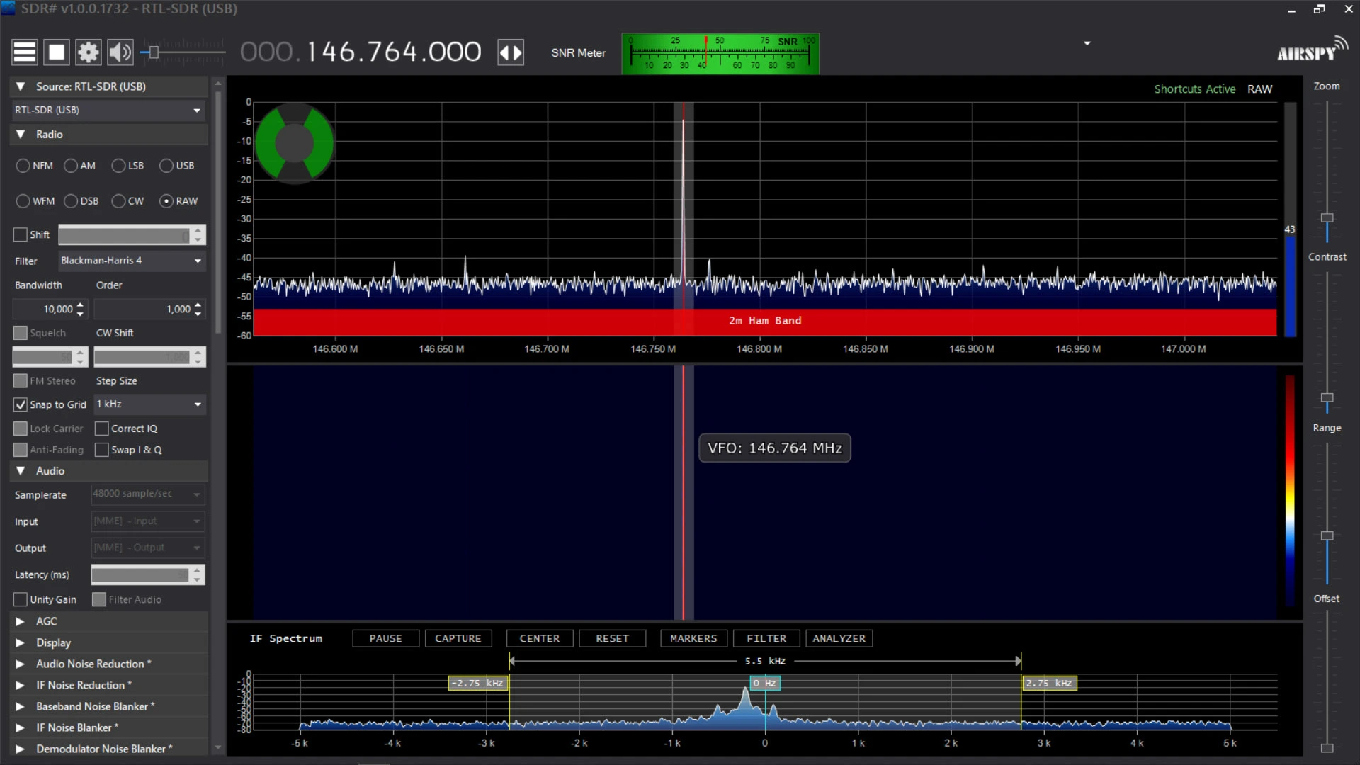 Loaded the SDR and POOF - It disappeared. Again. Okay, now I'm wondering WTF is going on here. Watched my 2m receiver and rebooted the computer. Rx (receive) indicator lit up (again, strong carrier and no modulation) and then went out as I saw the audio meters playing the "Windows" sound. Then it lit back up again. So I loaded an audio file into WinAMP or what not and POOF - It disappeared.