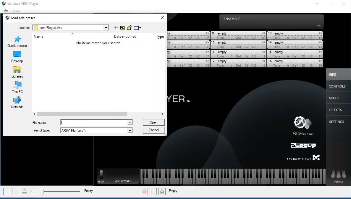 - In stand-alone, the program seems to open, but In the Ensemble box, clicking on “Load” in the pulldown will not open any ensemble choices. Instead, a screen showing the “com.Plogue.Aria” folder appears, with the notice “No items match your search.” (That is, the ariax files.) (See attachment 1)