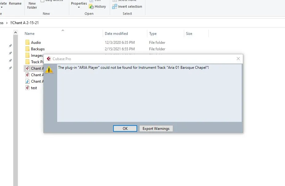 - Opening a Cubase project that already contains an Aria track, produces the notice “The plug-in “Aria Player could not be found for Instrument track [instrument name]” (attachment 3) The project’s Aria tracks are of course inoperable.