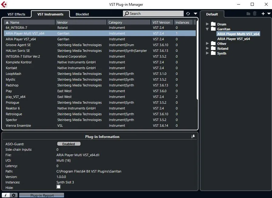 - Cubase’s VST Plug-in Manager shows that the Aria Player is installed, and Enabled. (attachment 4)
