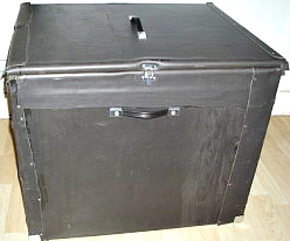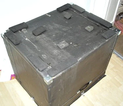 is what the amp is placed on. This picture also shows the inner box placed within the outer one. One box is heavy on it’s own. The two are immense ! The light coloured strips are markings to highlight the notches for the leads/cables.