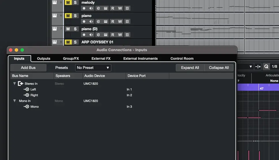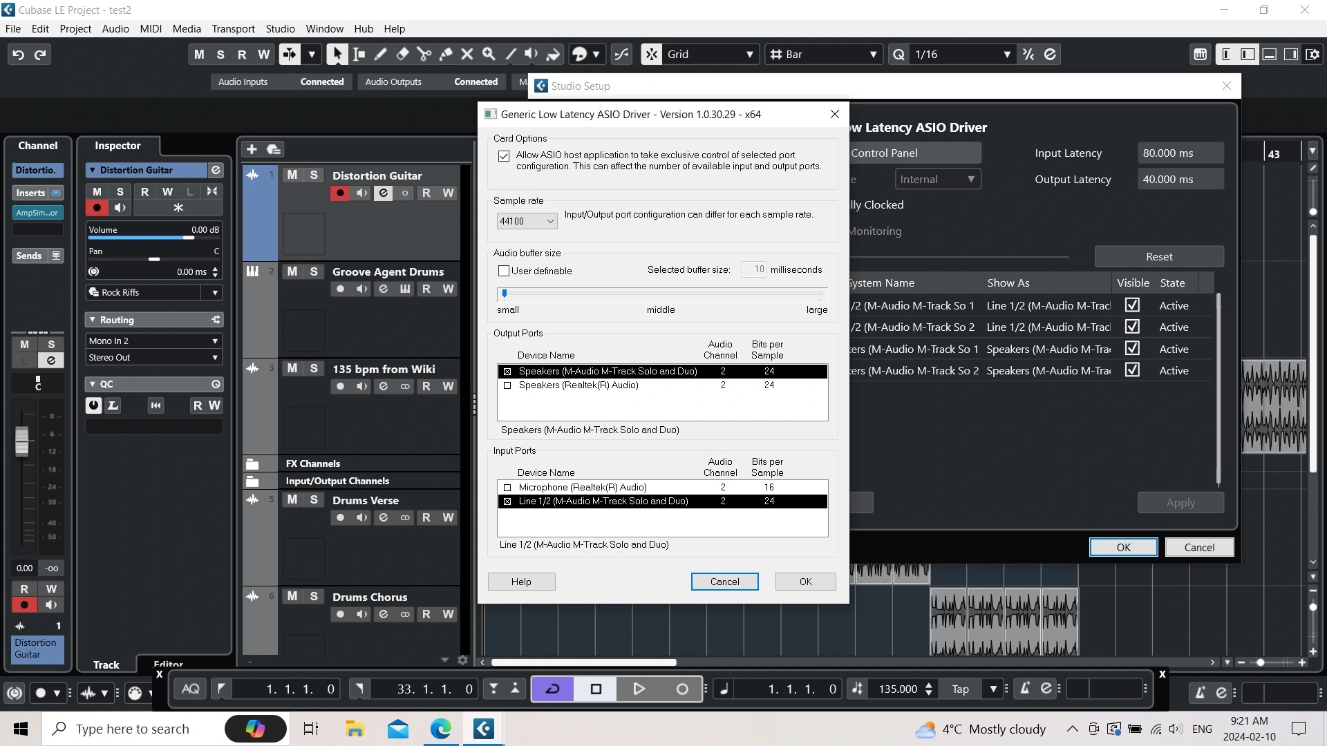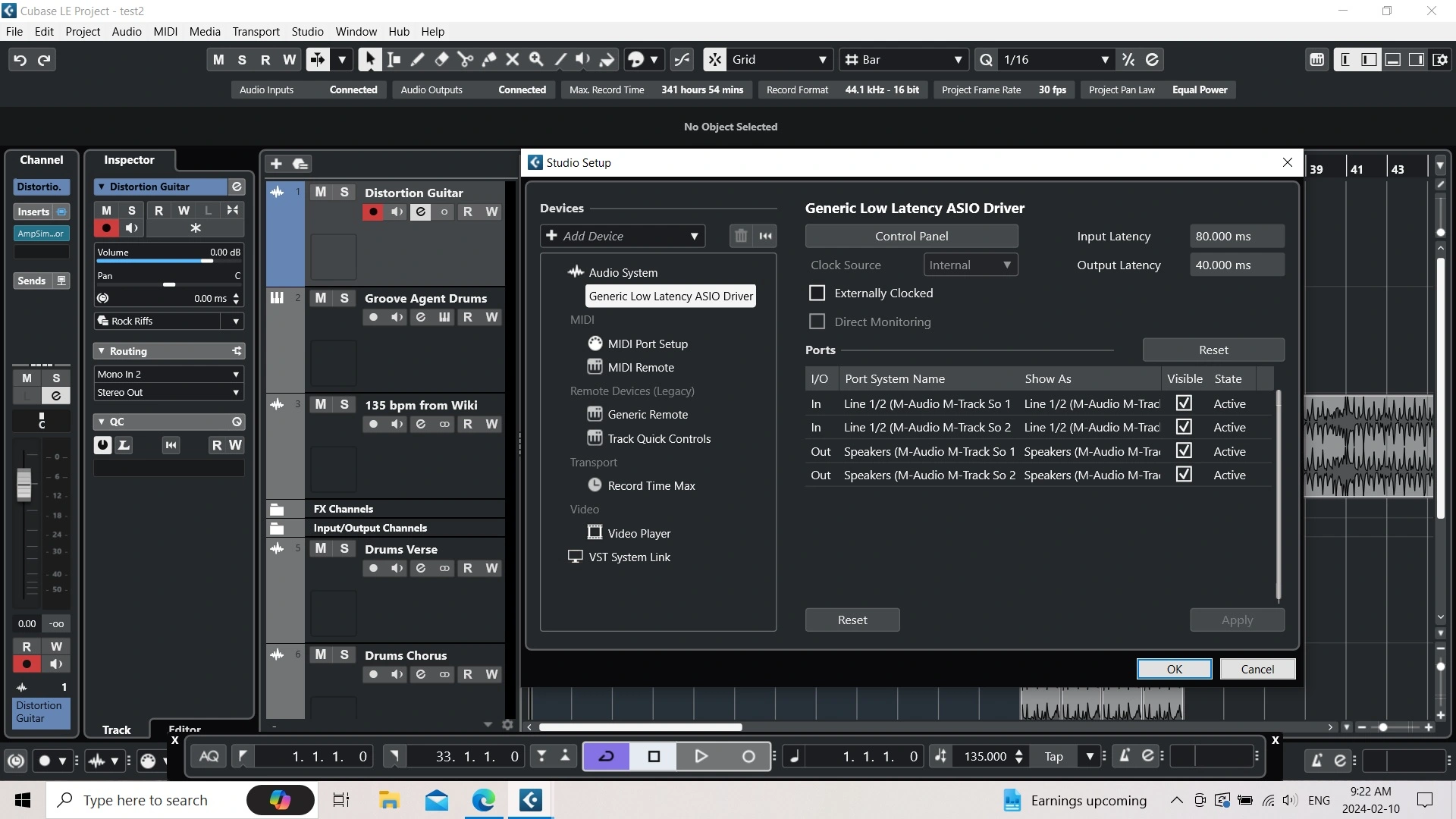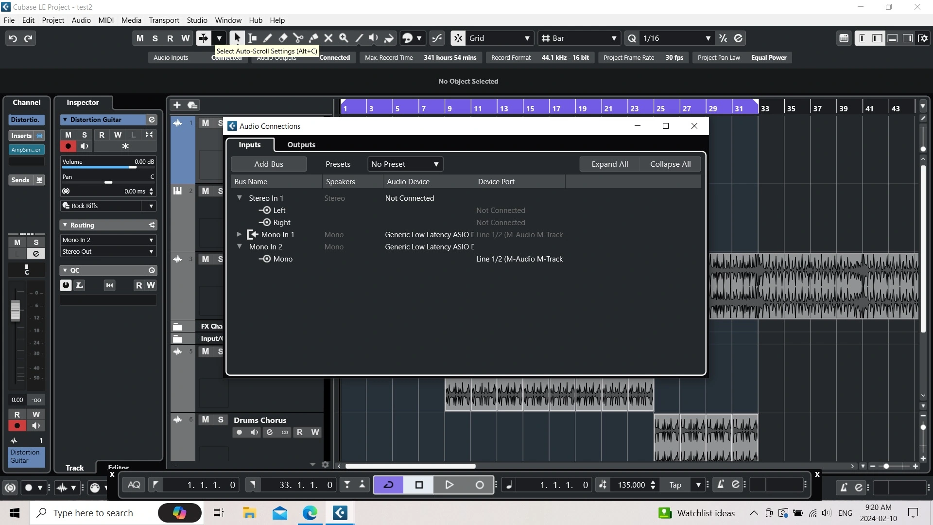 My guitar/cable/M-Track and laptop were set up at a music store (it all worked). Now back home nothing is getting in to Cubase LE. I have included screen shots of all relevant settings, to show that everything is mapped to/from Line 2 on the M-Track. When I strum the guitar, the green input LED on Input 2 of the M-Track lights up, so that is working. Output on M-Track is at 9.
