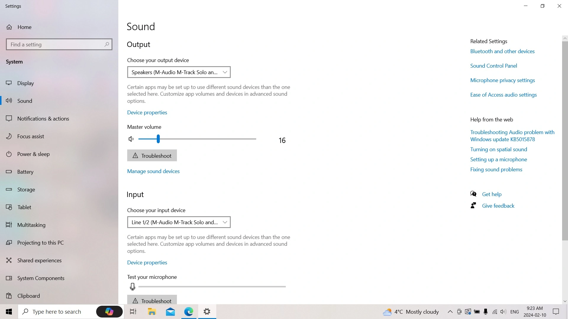 The Sound Settings on my laptop (Windows 10) are mapped to the M-Track.
