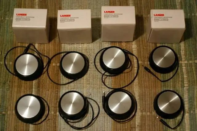 Hey, I got a free box of these mics. I have 15 or 20 of them and they were free. They're Lanier conference mics. They output to a mono 1/8 inch jack, and they have they have a 1/8 inch mono input, so you can chain them together. I've messed around with them a little bit, and they have an interesting sound. I've opened one of them up, but I don't have my camera with me. I'll post a picture of the insides when I get a chance. They have a metal grill with little rubber stoppers on the bottom so they don't slide on a table. I guess I'm just wondering if they would be worth messing with/modifying or if anybody has even heard of them. The model number is LX-008-0. I'm guessing they're dynamics.