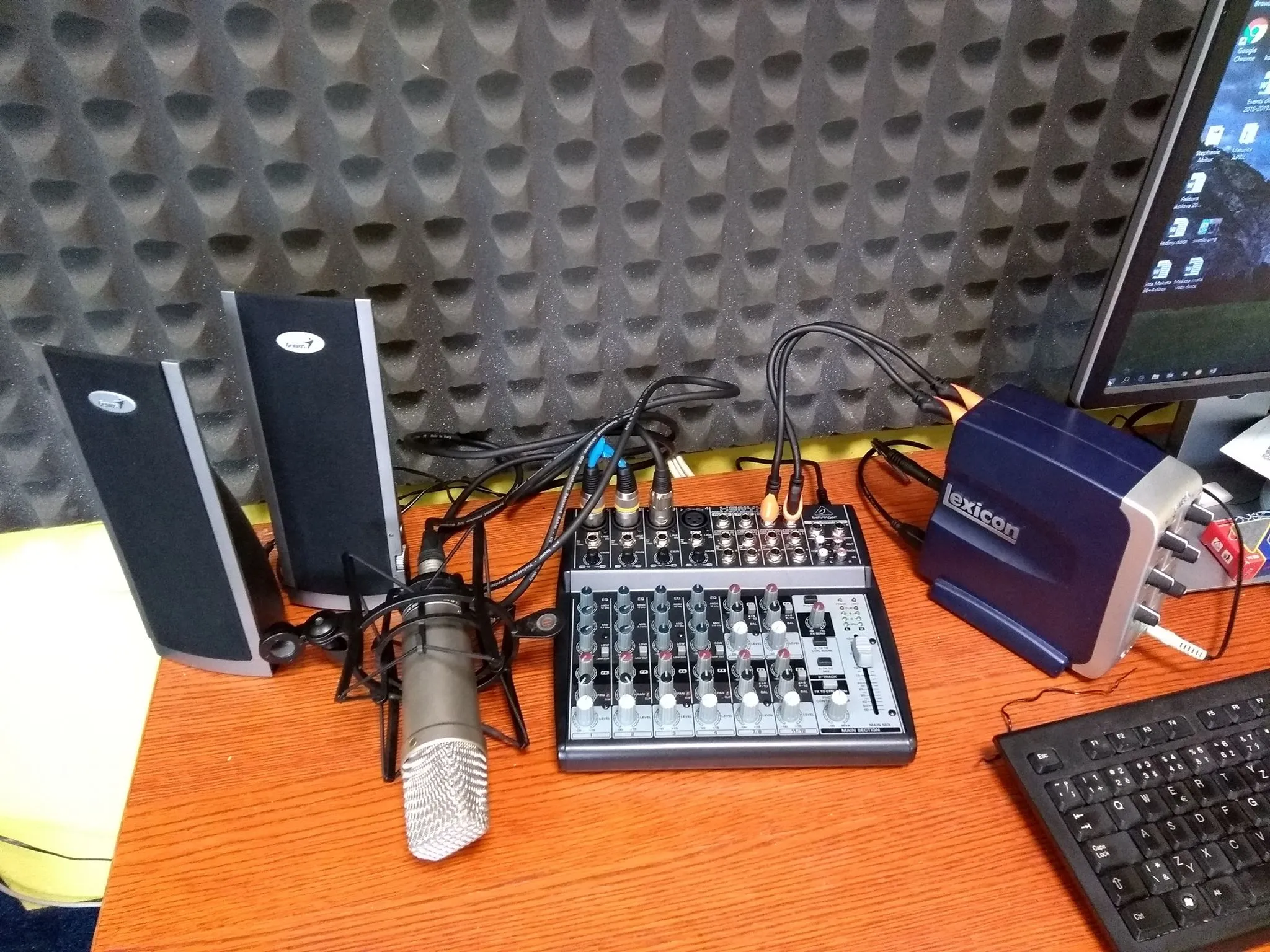 The recording studio is unusual and far from ideal. It is just a small closet at one end of the office, where our writers and editors are working at their computers. It is far from soundproof. It has the foam on the walls, but all that does is reduce echo. The current microphone picks up every single tiny little sound in the office, including typing, walking, coughing, etc. One of the most difficult parts of my job is trying to remove the background noises from the recordings. There is no way to stop people from working during these recording sessions. Our voice actors can't come in during the weekends, and deadlines are too tight for people to just not work for a day while we record.