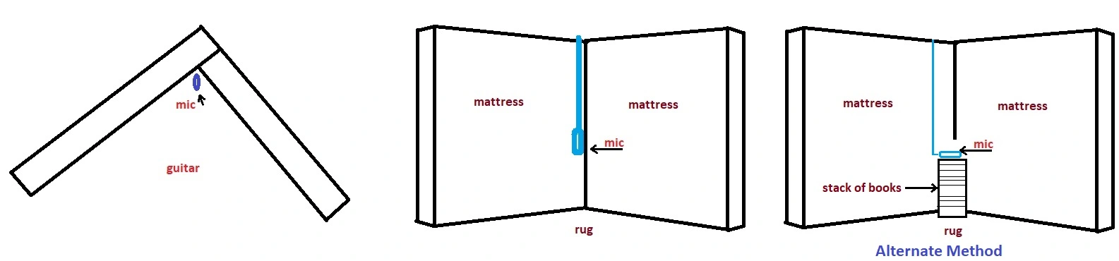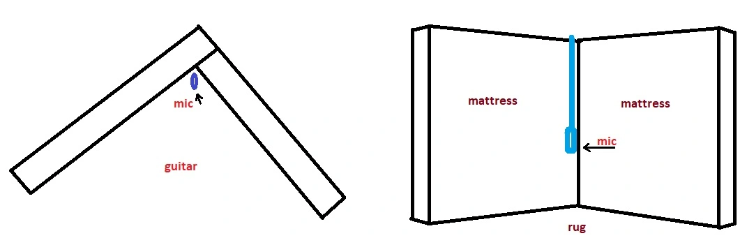Late to the party. That diagram is basically how I have been recording my acoustic lately. Except, the mattresses are walls, the room is a large walk-in closet, and behind me are layers of comforters and blankets. Behind the mic is a reflection shield, above it is a pillow resting on the shield (to stop sounds from coming into the mic from above), and...that's about it. I point the mic at about the 14th fret. I sit when I play, and the mic is straight up, hand height.