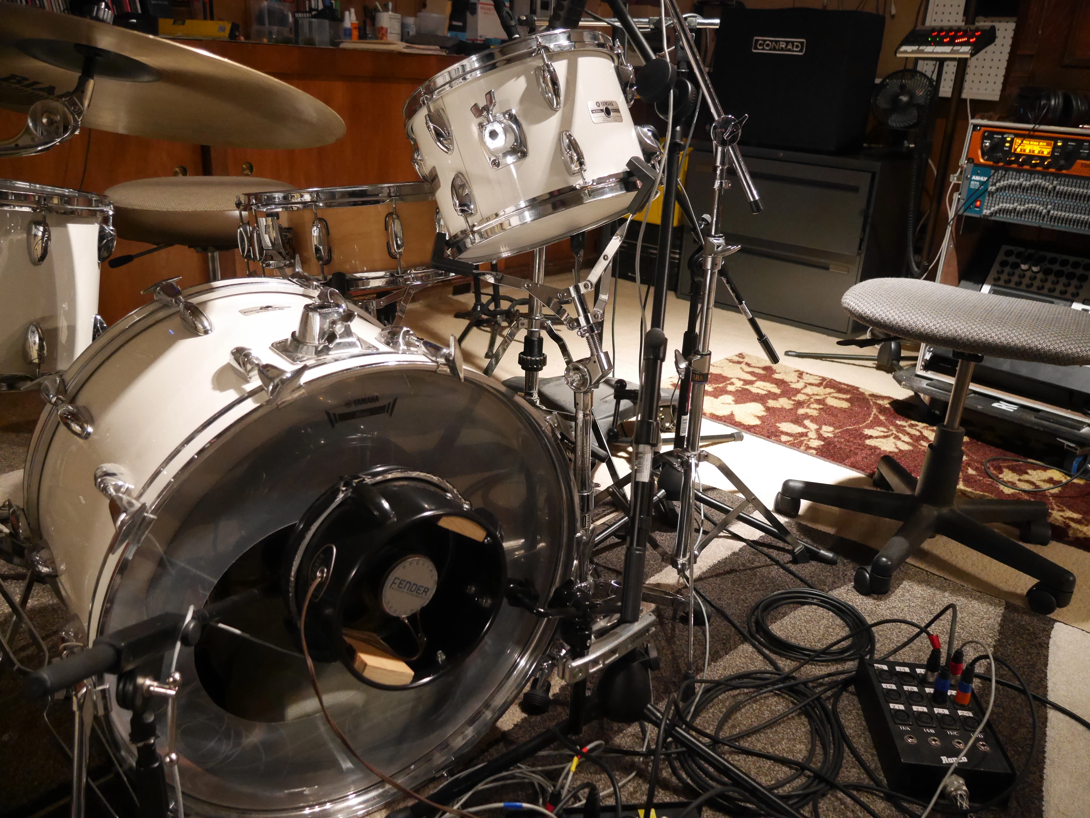 I use the sub kick to pick up more air pressure to move the speakers and add sub to the kick, by blending the inside mic and the sub kick (speaker) you can add low end body. I have also set up with a D112 inside the kick and a large Diaphragm condenser on the outside instead of the sub kick speaker. This has a different sound but still picks up extra low end of the kick drum.