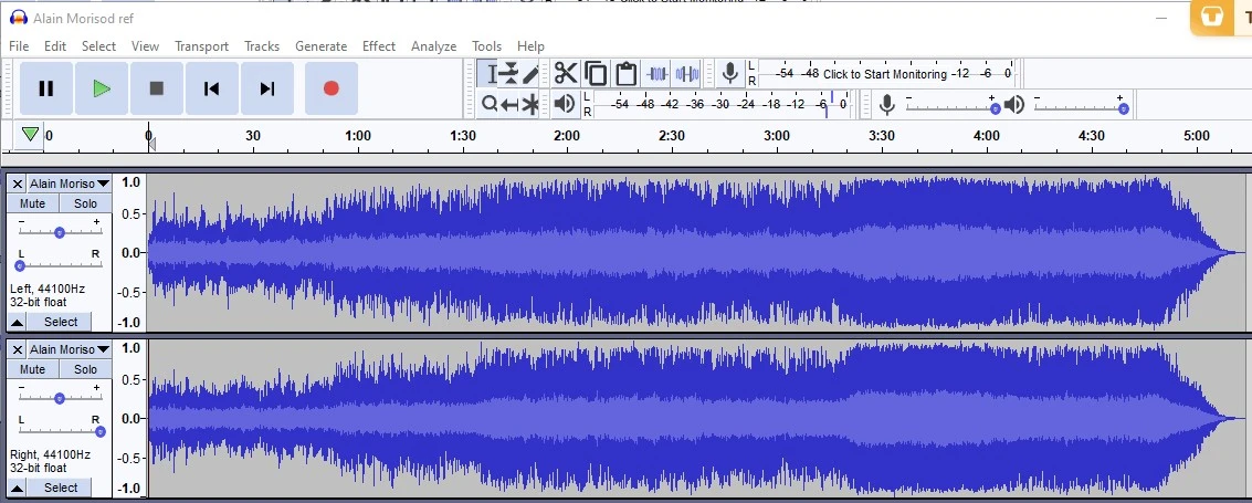 That's the ref. track. Now mine sounds just about as loud as his - but how the heck are they getting theirs that SIZE!?! Every piece I've ever written looks like wiggles in cotton, wave-form wise, compared to these guys - there's Something Dead Obvious I'm missing. I've put a limiter on mine and I know if I turn the Threshold to the left the waveform gets bigger, but then mine gets TOO loud. So I turn the instruments down so it's not too loud - and it's back to wiggles-in-cotton, but with the threshold knob turned farther to the left!