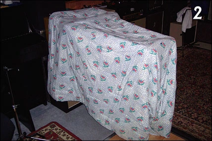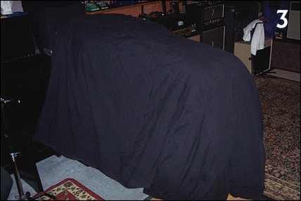 Since the rooms I was recording in were not "ideal" in my old studio at the old house, what I have always done in the past was put up a baffle around the guitar amp, but give it a couple feet of space around it (baffle behind the amp and to the right and left, but 4th side left open, no treatment above) with sometimes a carpet underneath and sometimes just the hard floor surface. See pic 1.