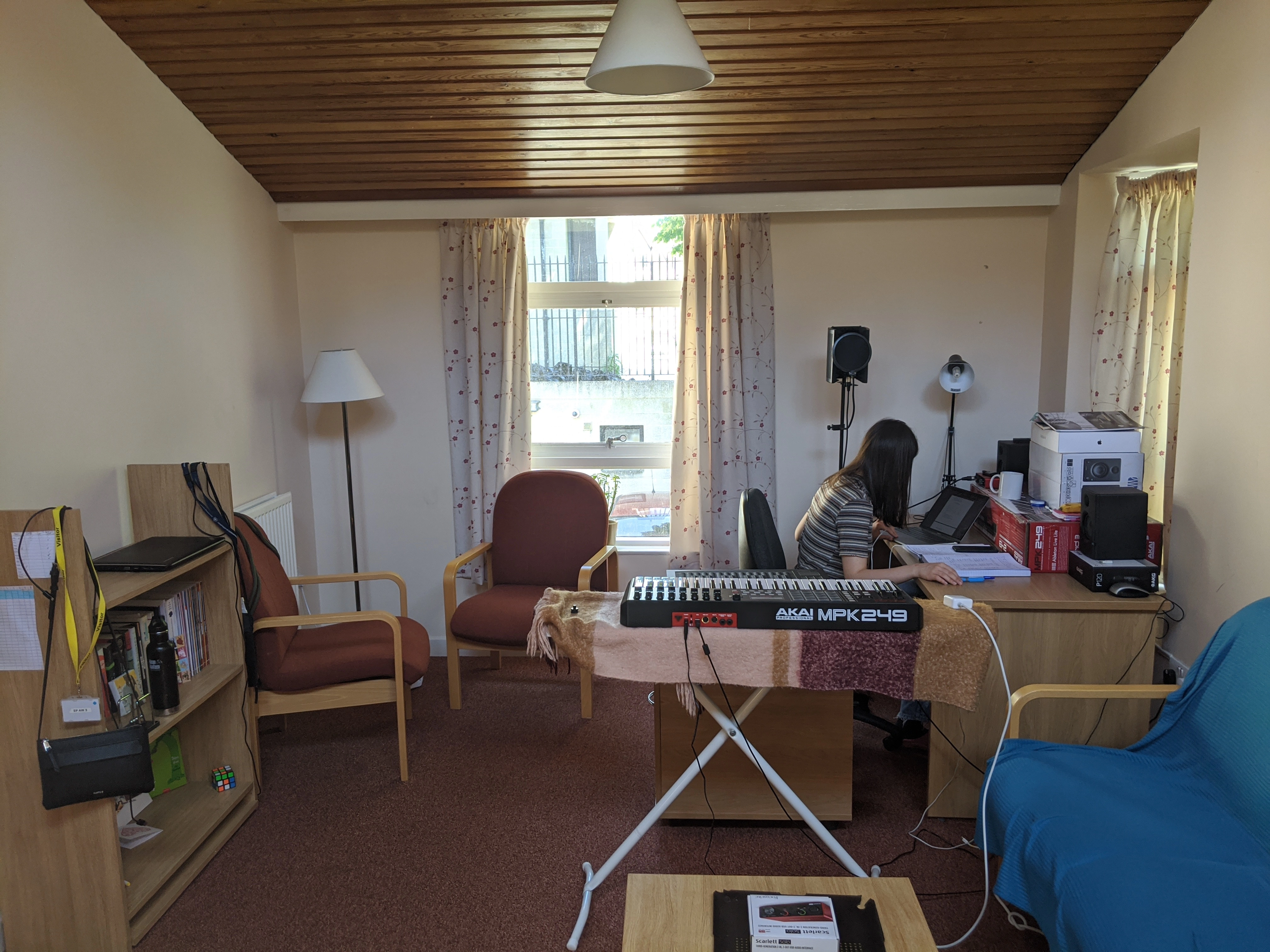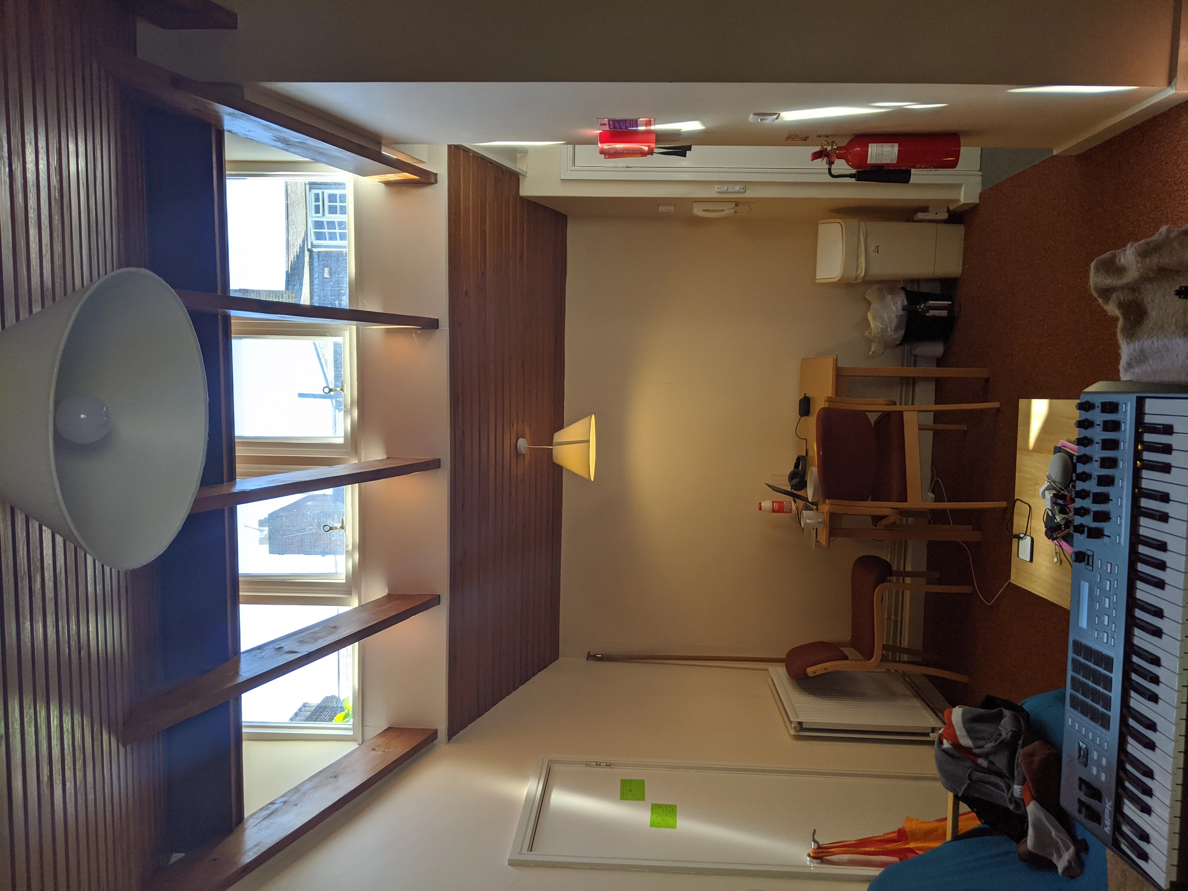 I am music producer outside my other regular job, and I make instrumentals, record vocals mix and master in my living room. My living room has this irregular shape (images below) and has an extension kitchen and windows. I am looking into suggestions on how to do some minimal but decently effective acoustic treatment (not isolation),to improve my experience with the stuff I mention above. Importantly, I will be living here potentially for two more years only, so ideally I want a temporary solution that can be reused elsewhere whenever I move, and I also can't damage the current place in any way.