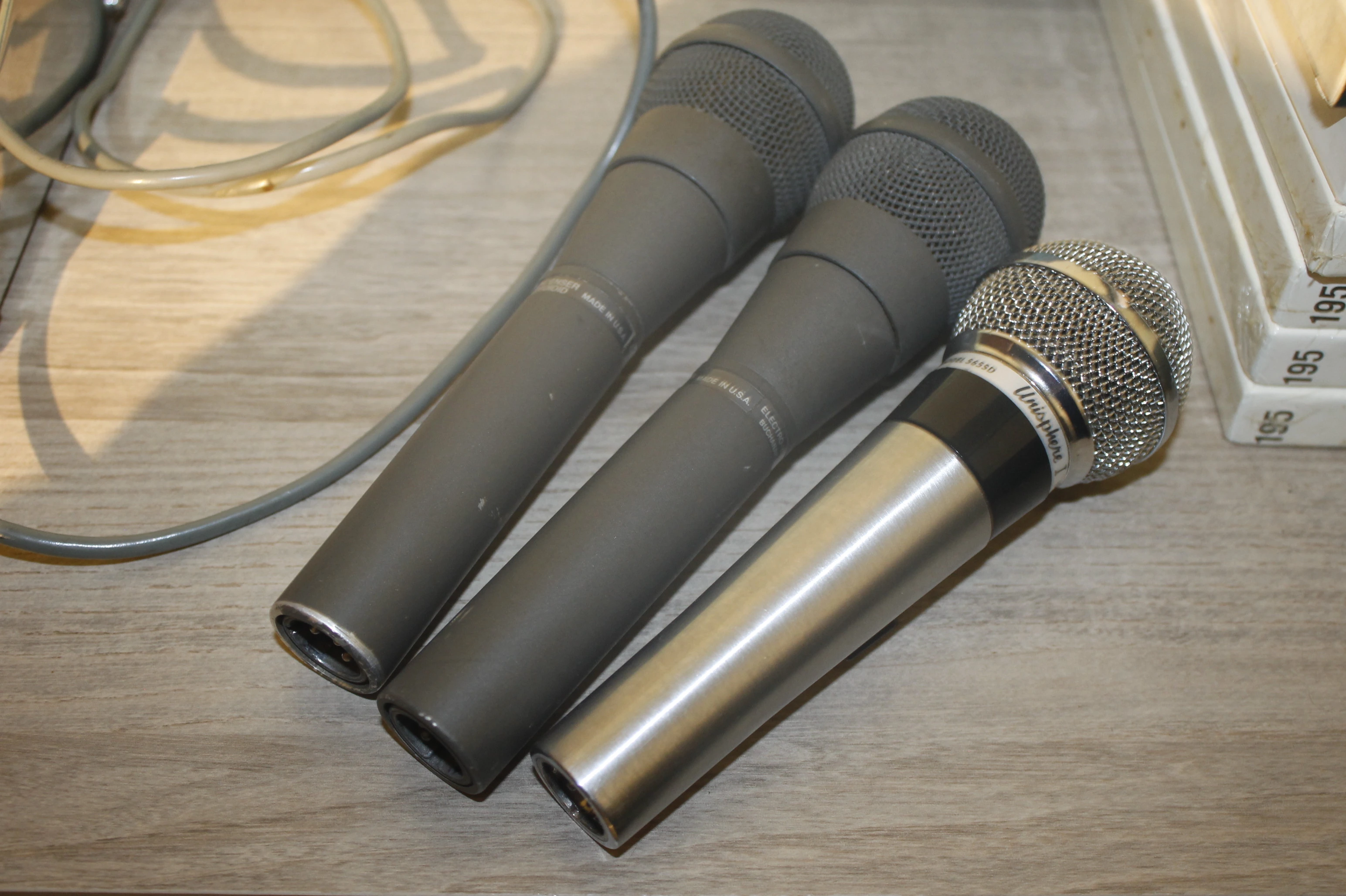 The Shure 565SD is not a very good microphone - the EV PL77s are decent but I would use them as overheads.The three mics would be 2 EV PL77 (overhead, snare) and a Shure 565SD on the bass drum. They're all pretty old, mid 1970s.