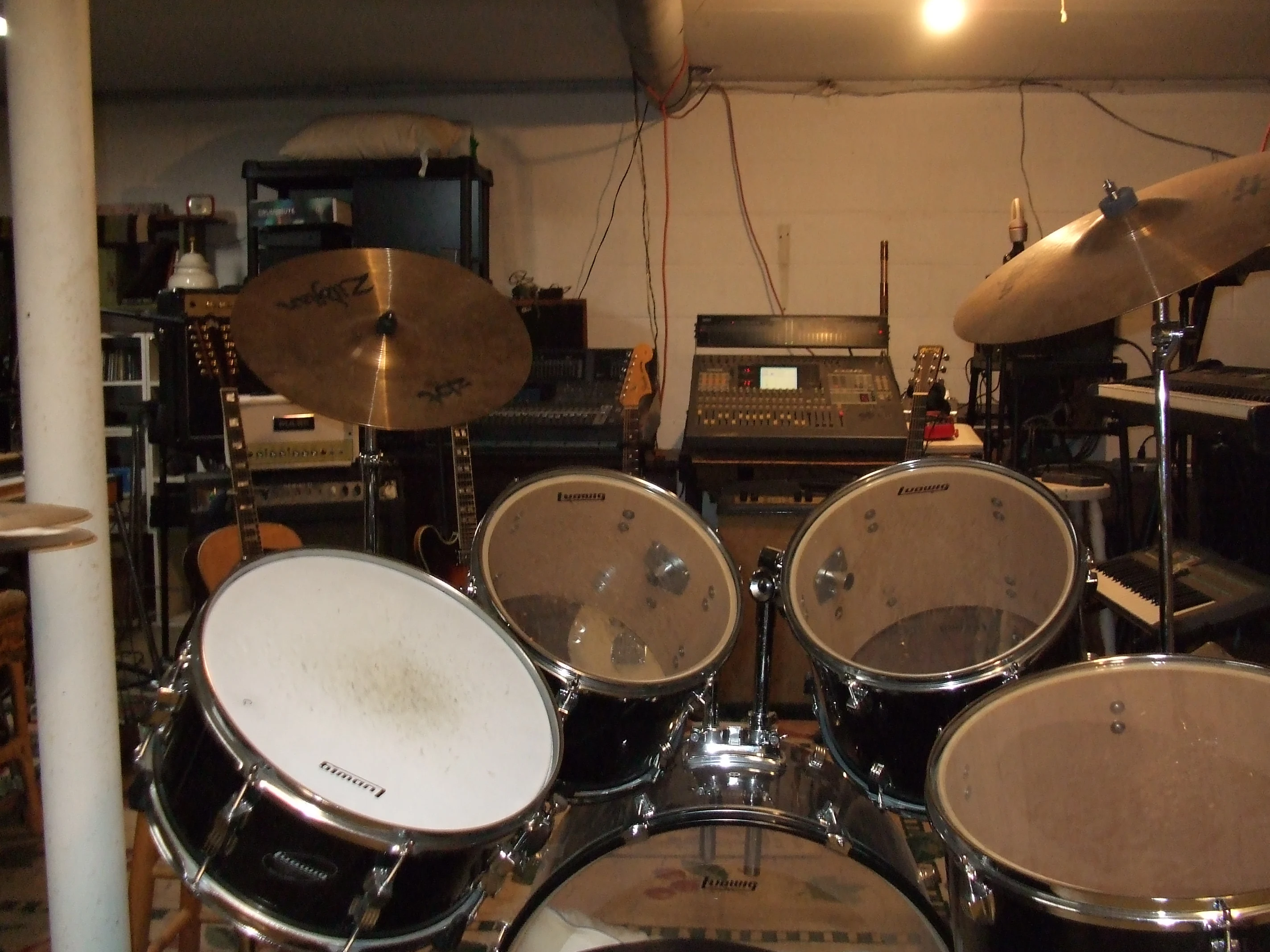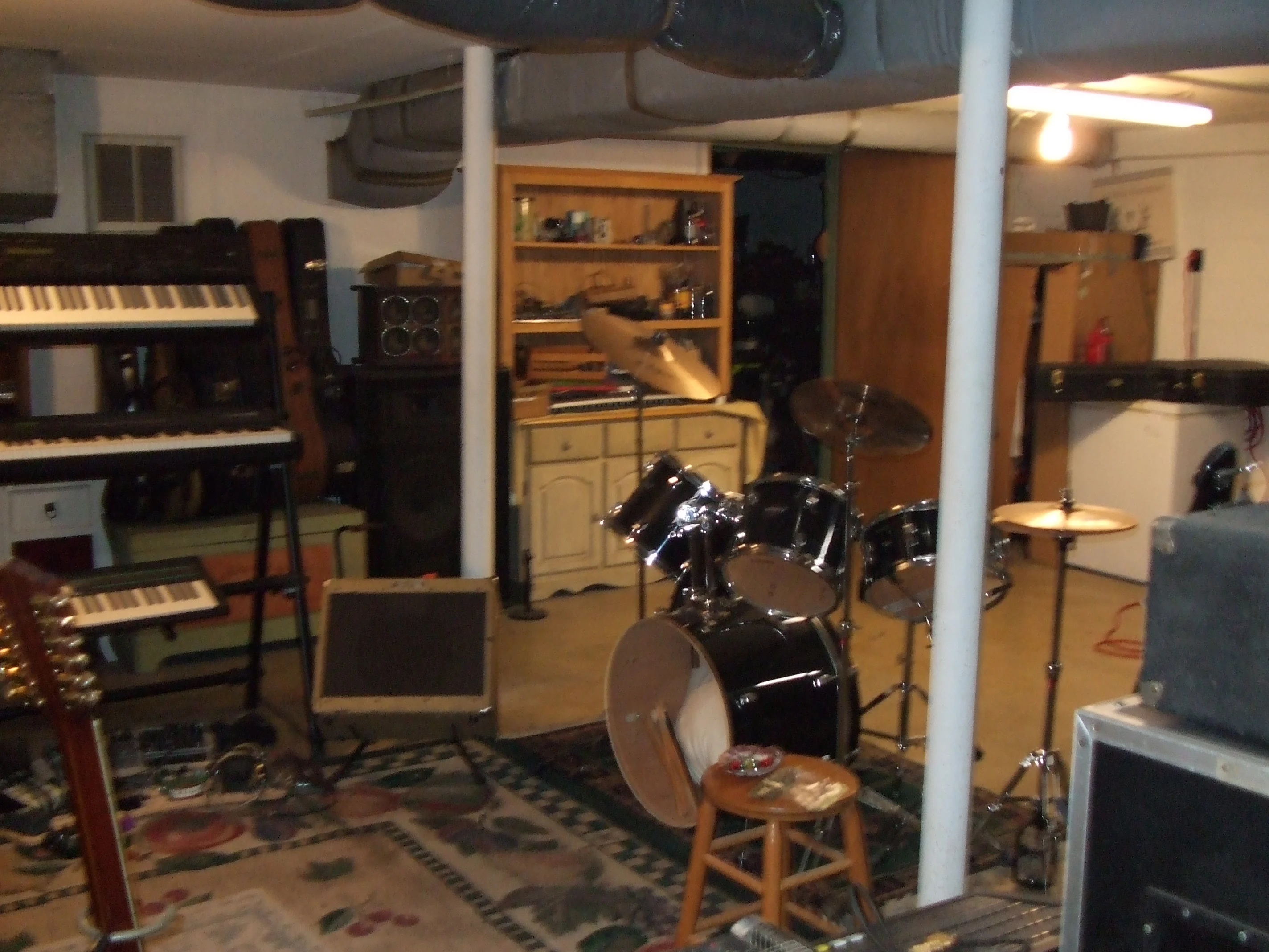 My grow room lol. If you look at the back wall you can see the white freezer. Next to the freezer with the guitar case on top of it, is a large cardboard box. The door to the other side of the basement is partially blocking it. The cardboard is three sided backed up against the basement wall. The box and wall are lined with Christmas silver foil I bought at an after Christmas sale along with the tape I used to put it up. The front of the box can be opened like a door. I think the whole thing cost maybe ten dollars. It's where I keep my aluminum foil hats. Coming down through the top of the box is the grow light. I could actually build a vocal booth right there and use it as a grow room also!