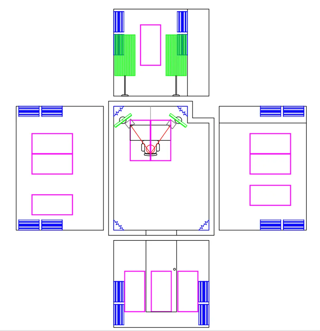 I am a little confused. I read everywhere that the best mix position is in the middle of the room which sounds logical to me... Although my room is not rectangular, most of the room is (see picture). Now I asked Auralex for room treatment and how I needed to do it in my studio and they placed me out of the center between the small corner and the long wall. Now I was wondering whether this is correct or not? Why not put me in the center? I am confused... Can somebody explain me why this is the best position?