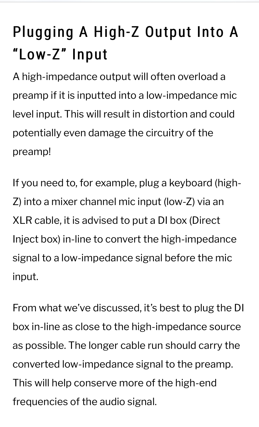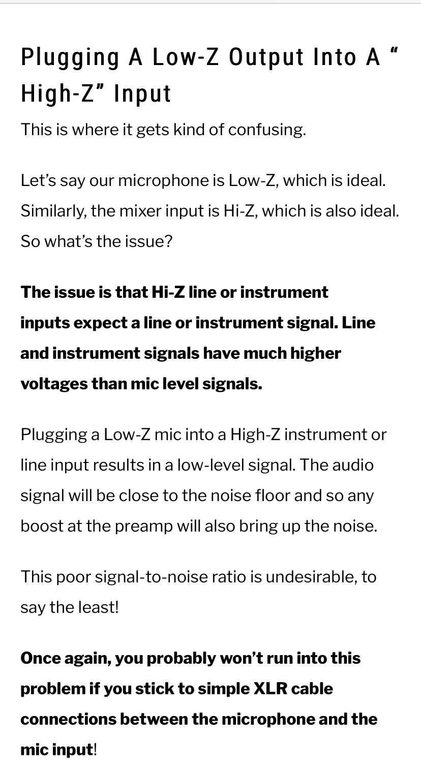 It's so easy to misunderstand how AC circuits work. Even for those who did physics at school, it usually boils down to Ohms Law - and we worry about voltages, resistance and currents and making circuits. They deliberately don't go into AC circuits because then resistance becomes impedance and there's a big step up in the things that impact on AC - so inductance, capacitance and resonance suddenly creep in. Teachers of the subject have to take a deep breath before leaping in, because misunderstanding is so easy, and when non-teachers who do understand it try to explain it they fail, and those that haven't quite got it (like in those examples above) fail miserably. In fact, when you get it right, you can squirt audio down extremely long lengths of cable with decent results. Mic wise - we all kind of take 150-600Ohms or so as 'normal' for mics - but back in the 60's/70's we had high impedance versions or switchable ones) so you could plug a mic into a jack on a guitar amp. Many also forget that at this period we also had some mics in very low impedance versions - 25-50 Ohms.