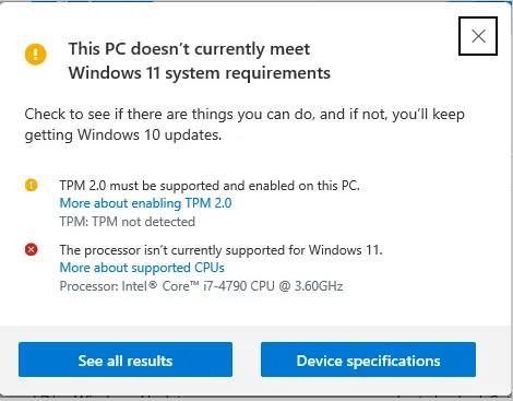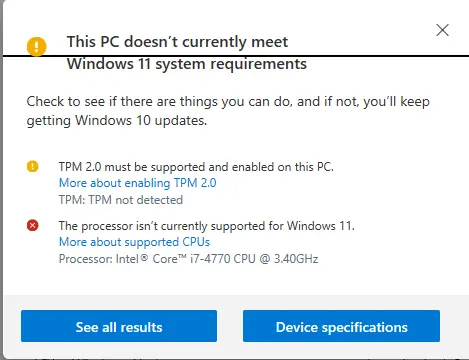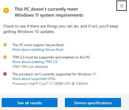Not one passed - forget the TPM thing, NONE of my processor are approved? What is going on? Microsoft have a new OS that won't work with my computers and when I chose them, there was no big warning saying Danger - dodgy unsupported processor! Why are these intel chips not on? They're not old and they're not cheap - so what gives?