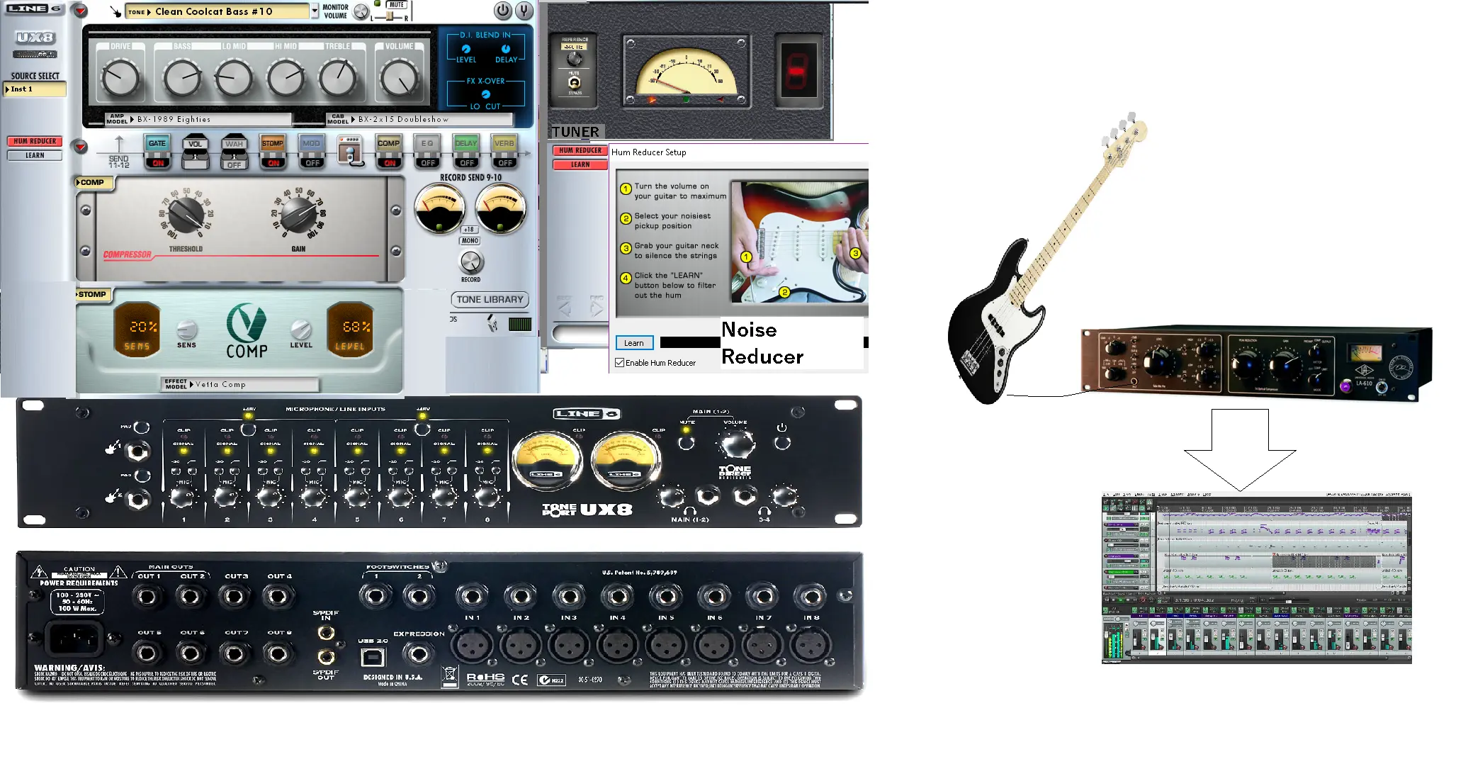 the Bass was plugged in, the large knobs are very fast & easy to use.. large knob on the LA610 are just cool in a vibe way, the comp works as it should, its a real tube design and this is what it sounds like. ..but...... again, hmmm...my single coil noisy antenna Squier Bass is waay too noisy.