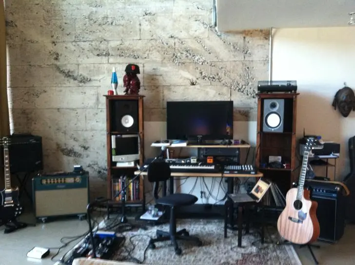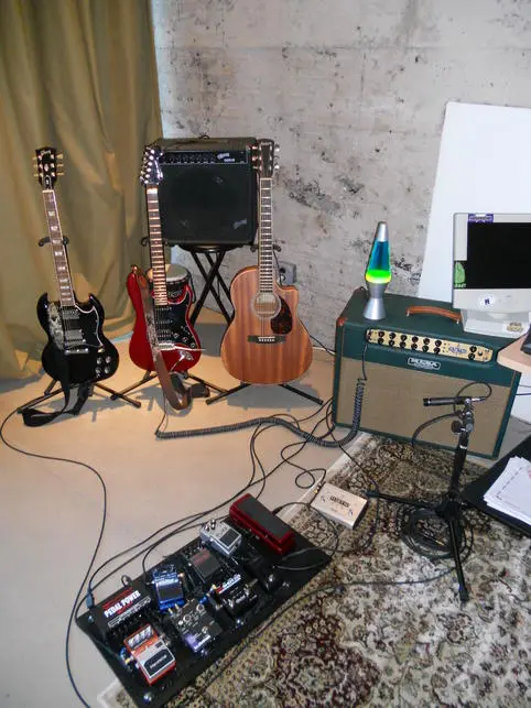 I like the African mask too - I collect stuff like that. Nice amp and pedal collection. Looks like a good place to make some MUSIC