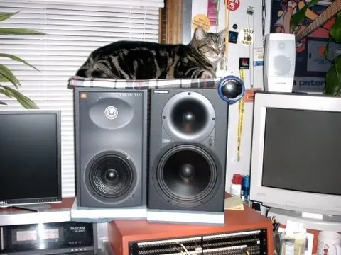 I kicked her off the audio monitos...now she likes to hang on top of my old CRT monitors, just to the right in the picture. She's obsessed with my studio, can't wait to get in there with me and will sleep through any kind of racket I make. I also have a big old black cat, and he likes to hang up there with her, but he doesn't like it when I'm tracking lead guitar, as I track a bit on the louder side, but the other cat doesn't even blink.
